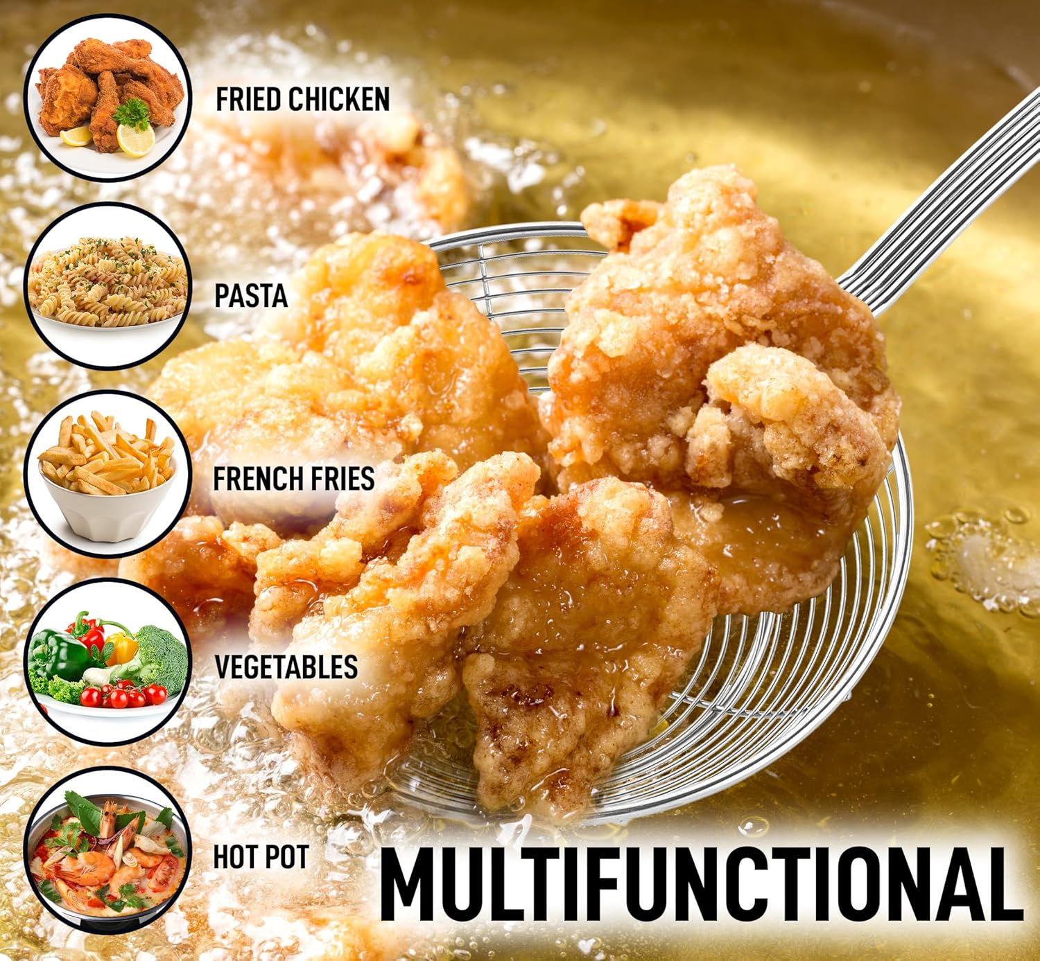 - VERSATILE & AFFORDABLE: Its straining basket is deep and contains more space, making it perfect for holding more items than regular mesh strainers or slotted spoons. Its standard size of 15.35 x 5.4 x 2 inches is perfect for giving you both maneuverability and security when frying or straining food such as noodles, pasta, boiled eggs, potatoes, chickpeas, and more.