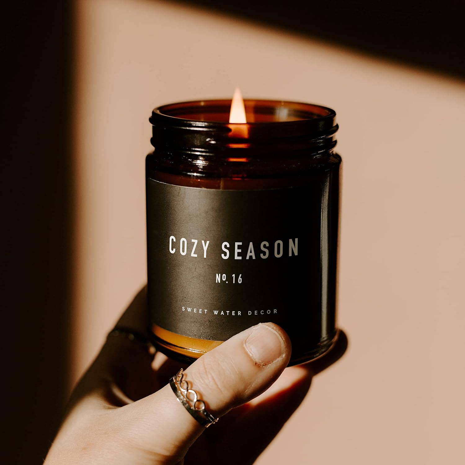 Sweet Water Decor Cozy Season Soy Candles - Fall Candles with Woods, Warm Spice, and Citrus Scent for Home Decor - Soy Candle with 40 Hours Burn Time - 9Oz Black Lid Amber Jar Candles Fall Scents
