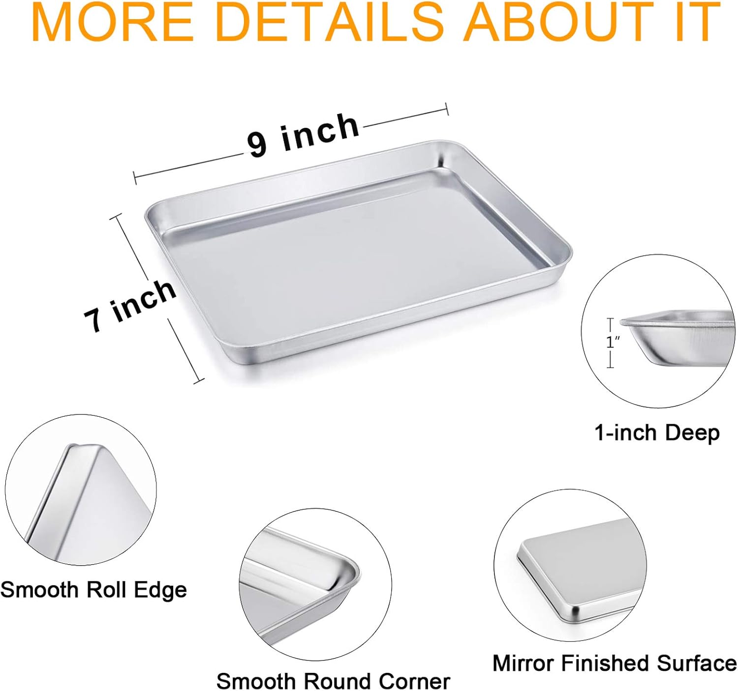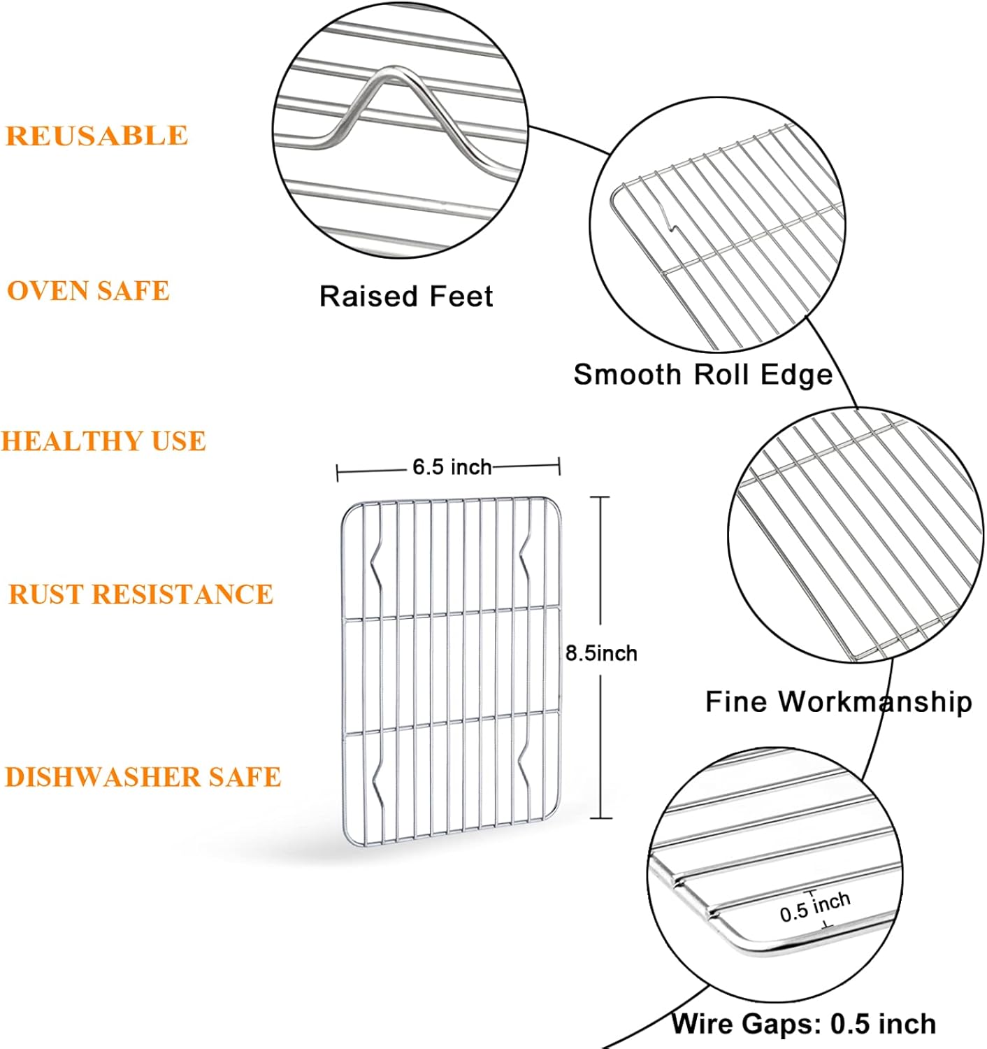 - Multi-Use: 9 x 7 x 1 inch Toaster oven pans with 8.5 x 6.5 x 0.6 inch cooling rack set of 4, Sufficient for personal amounts and efficient for food preparation for the next turn, No worry about the leaching of chemicals, A great replacement of aluminum pan