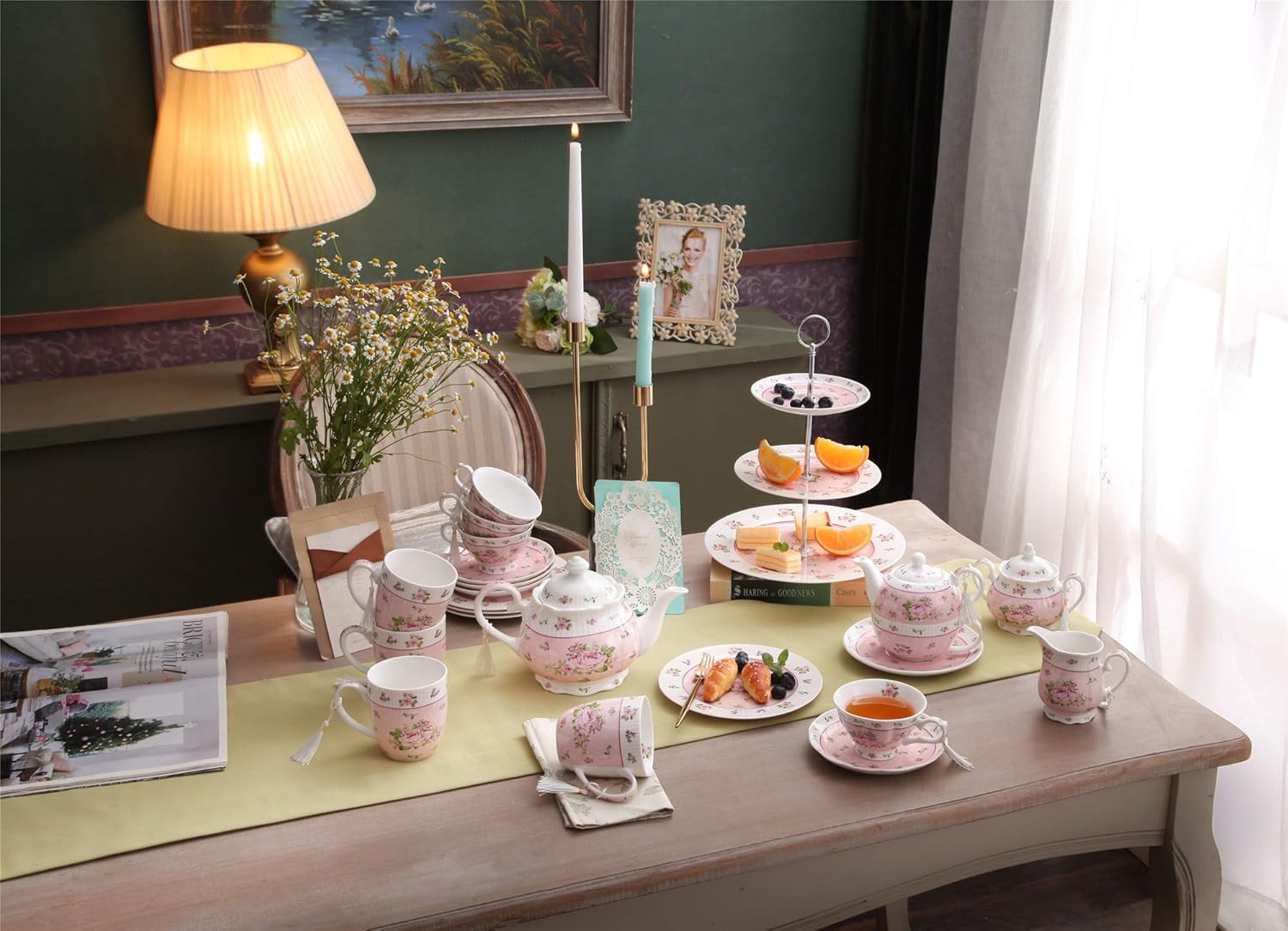 London Boutique Porcelain Teapot Sugar Bowl and Cream Milk Jug Shabby Chic Vintage Floral in Gift box 40oz (Teapot Rose Pink)
