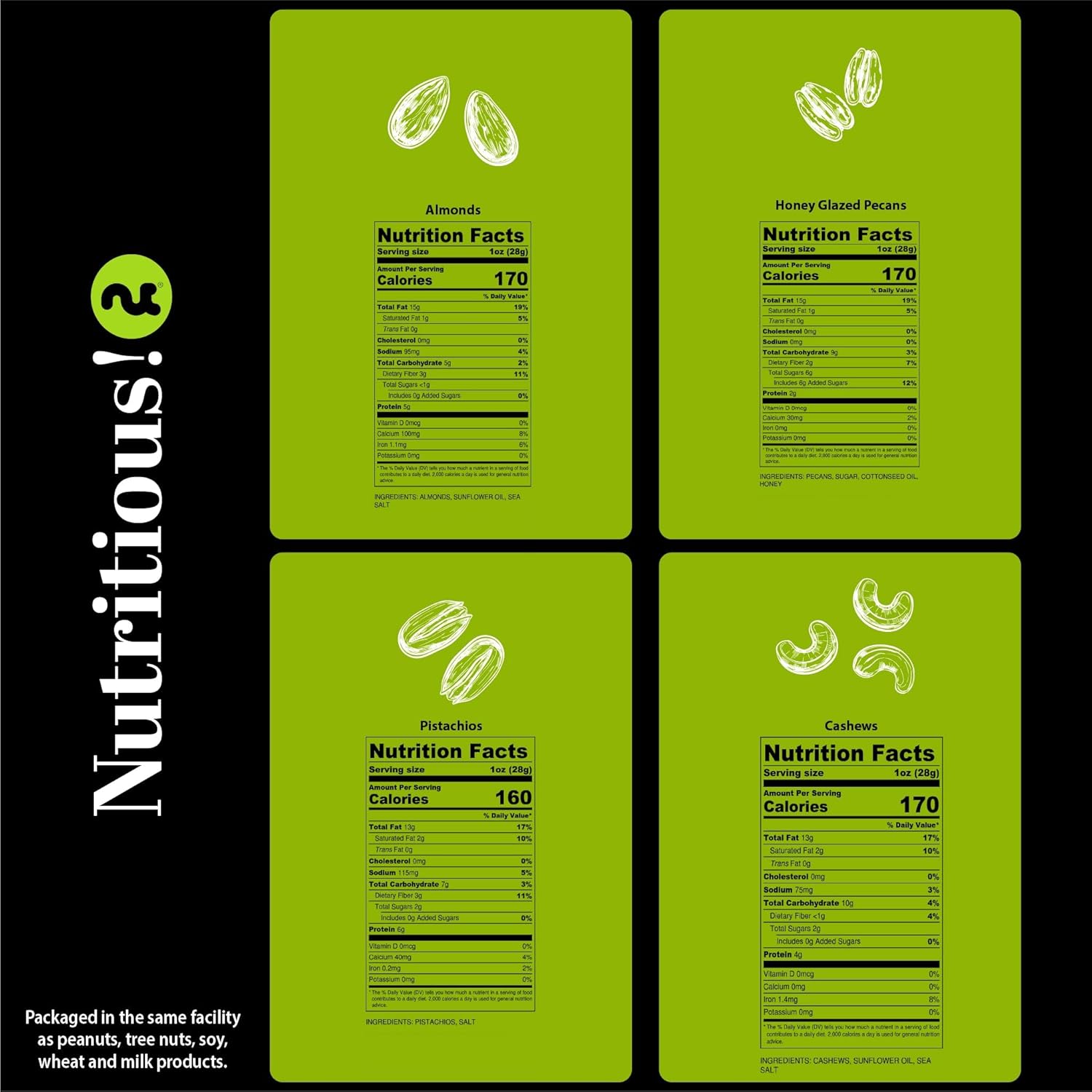 - A SELECTION OF 4 OF OUR BEST NUTS: Our Green and Gold Gift Box includes a handful of each of our 4 signature delicious nuts: Almonds, Honey Glazed Peanuts, Cashews, and Pistachios. All naturally grown and handpicked by our farmers around the world. Weight: 12-16 Oz.