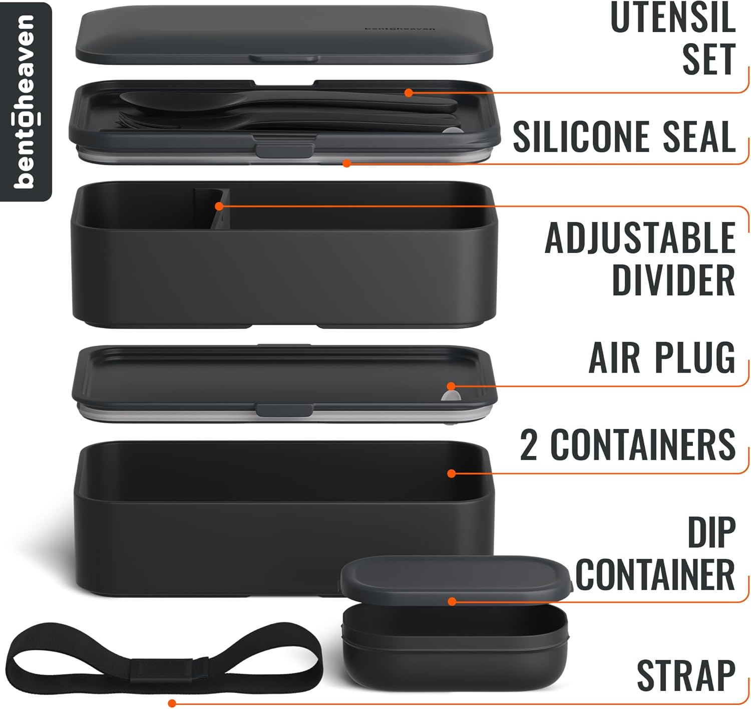 - Your meals deserve a Premium Bento Box! It features 2 stackable compartments that hold 40 oz., 2 silicone sealed lids, divider, dip container, chopsticks, fork, spoon, knife, and a sealing strap.
