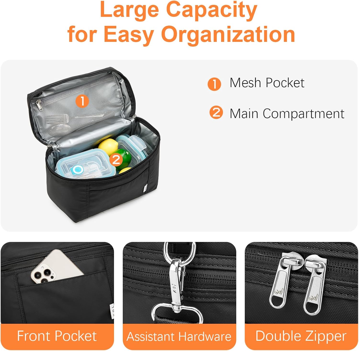 - Construction & Pockets: 1 main compartment with zipper closure(double zips in NOL), 1 interior zip mesh pocket can fit paper napkin, handkerchief, keys, or cellphone. Outside 1 insert pocket in the front of the bag for small essentials. Our lunch bags for women/men is spacious enough to fit your lunch box, snacks, and drinks and prefect to take foods and snacks with your outdoor activities.