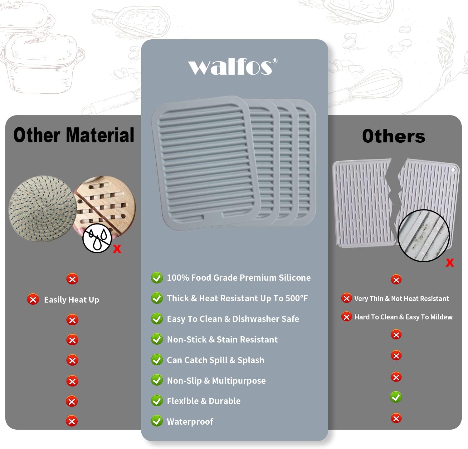 - ★ HEAT RESISTANT UP TO 446°F - Walfos silicone trivet is heat resistant up to 446°F, Raised wide ridges of heat resistant mats for countertop will separates the hot pot from the table, protect your kitchen surfaces from scalding.
