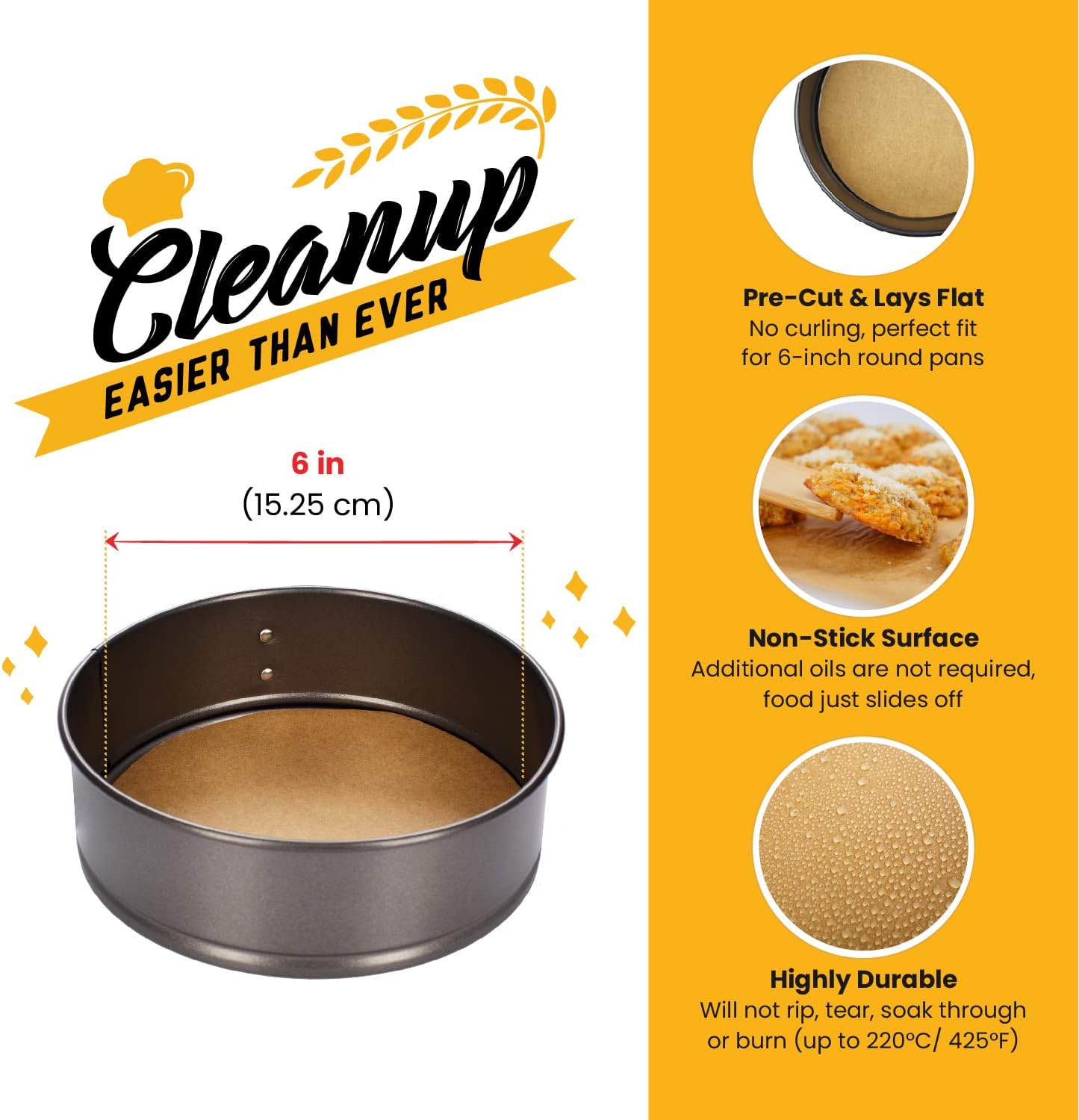 - SAVE YOURSELF THE HASSLE – Are you tired of wasting time cutting a perfectly sized liner for your round cake pans? Well, your struggles are finally over. Baker’s Signature precut, and unbleached baking sheets are just right for your 6-inch pans. Our sheets do not curl, stick or burn leaving you with just one thing to do – let your delicious recipes come to life! Perfect for baking your favorite cakes, tortes and more. Our parchment rounds will take the hassle out of your baking, guaranteed.