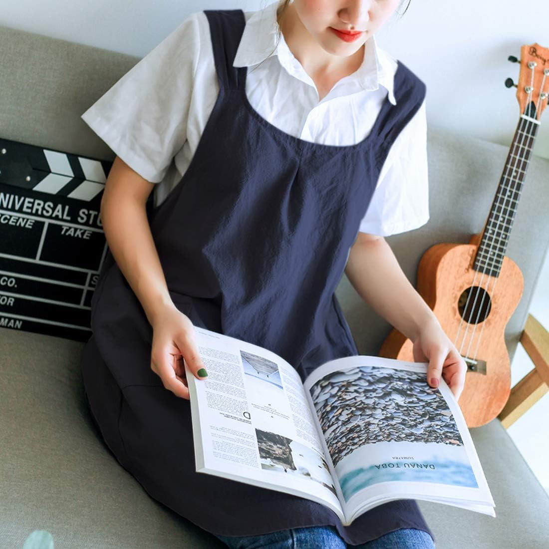 NEWGEM Japanese Linen Cross Back Cooking Aprons for Women Men with Pockets Cute for Baking Kitchen