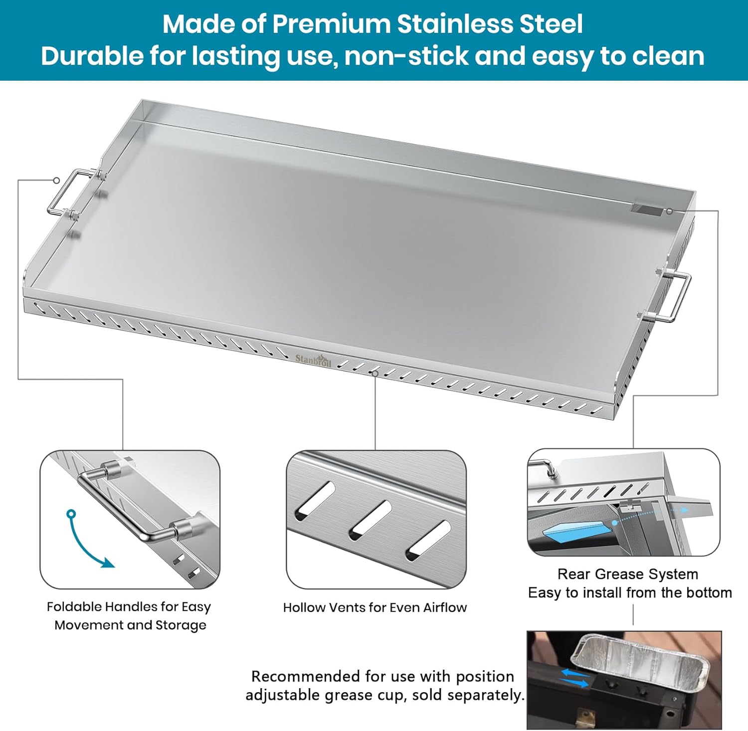 Stanbroil 36 inch Stainless Steel Flat Top Gas Grill Griddle Replacement for Blackstone 4 Burner Gas Grill Cooking Station, Flat Top Griddle with New Rear Grease Management System
