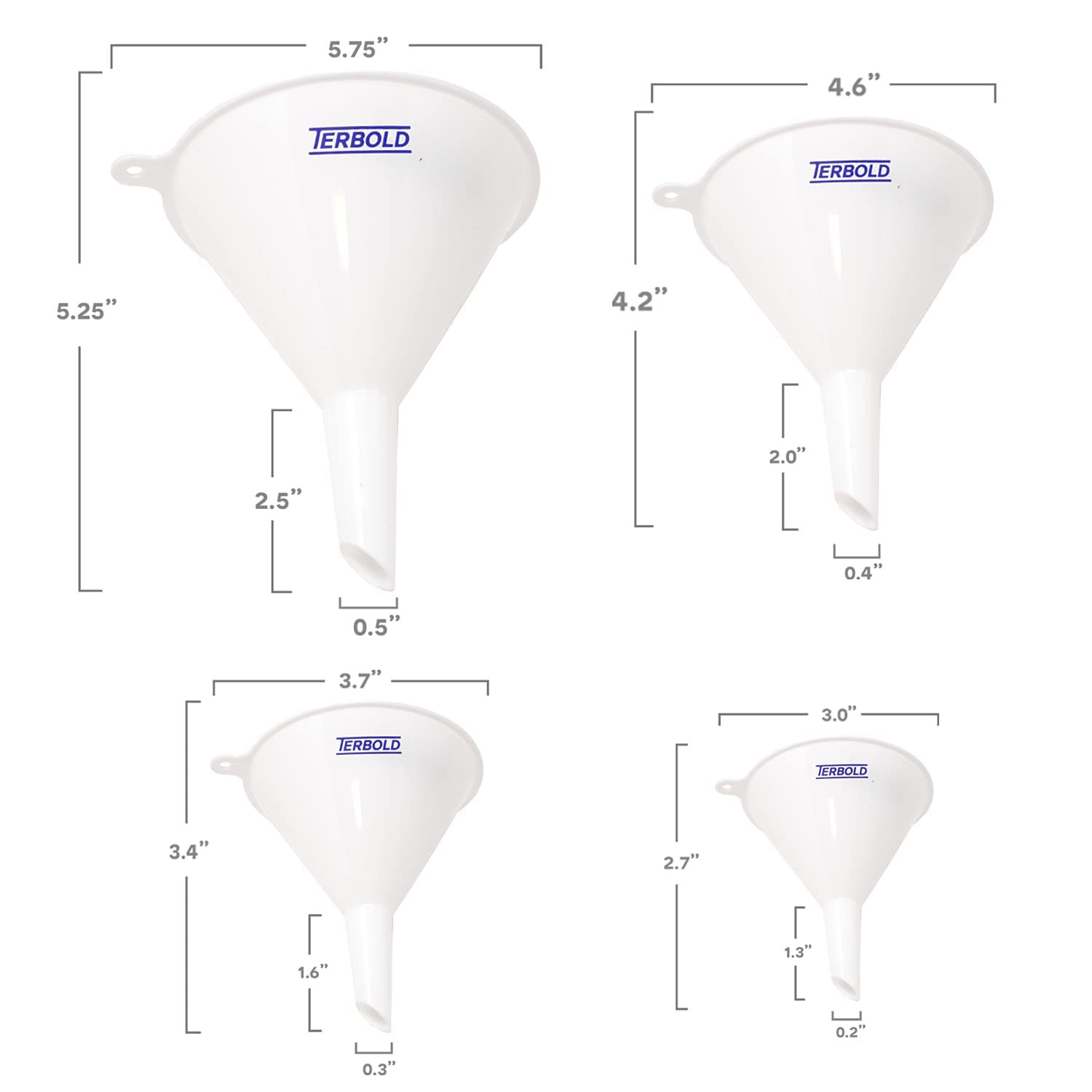 - COMPLETE SET | Having the correct funnel size matters when you need careful, precise transfers of liquids and powders. This set includes 125mm, 100mm, 75mm, and 55mm wide diameters