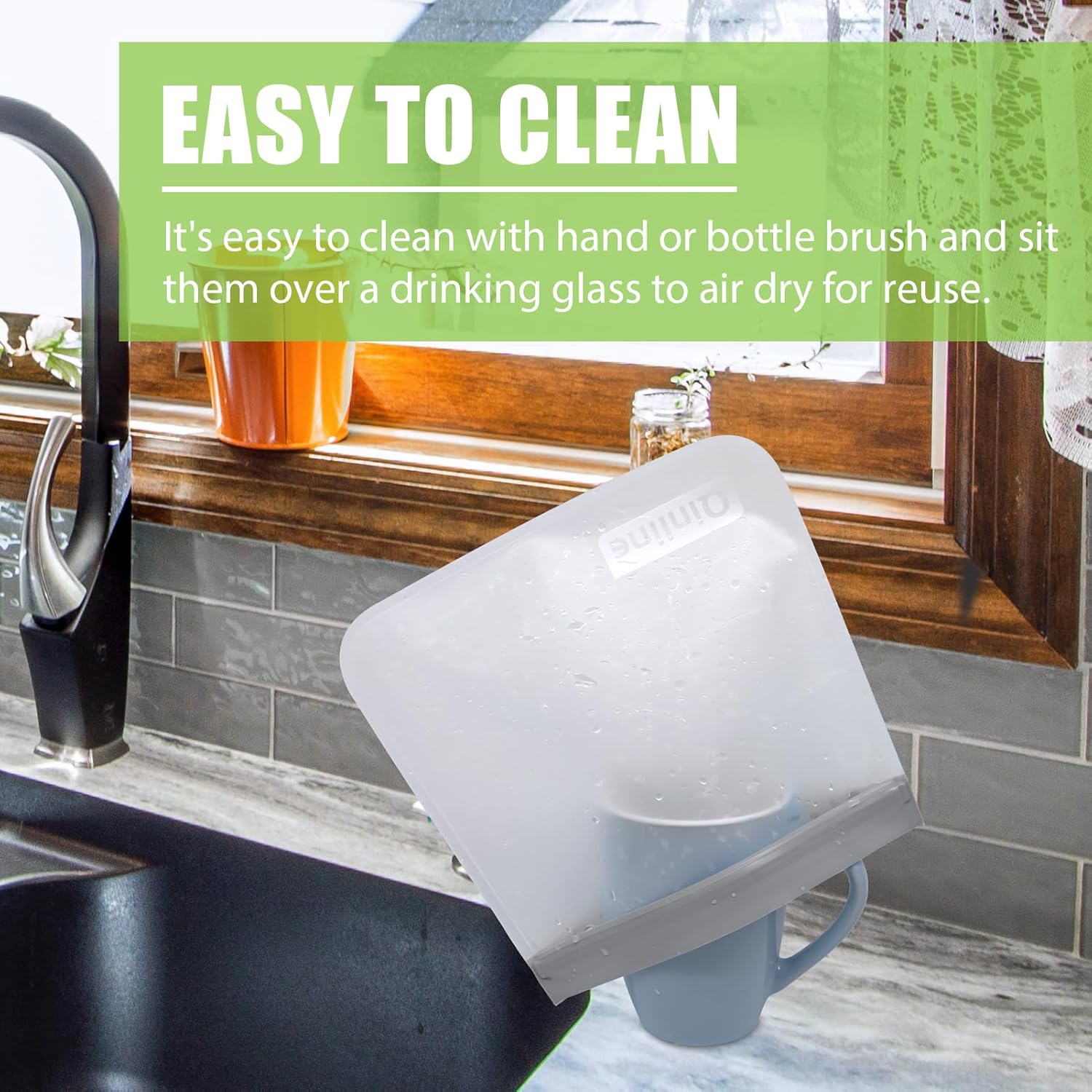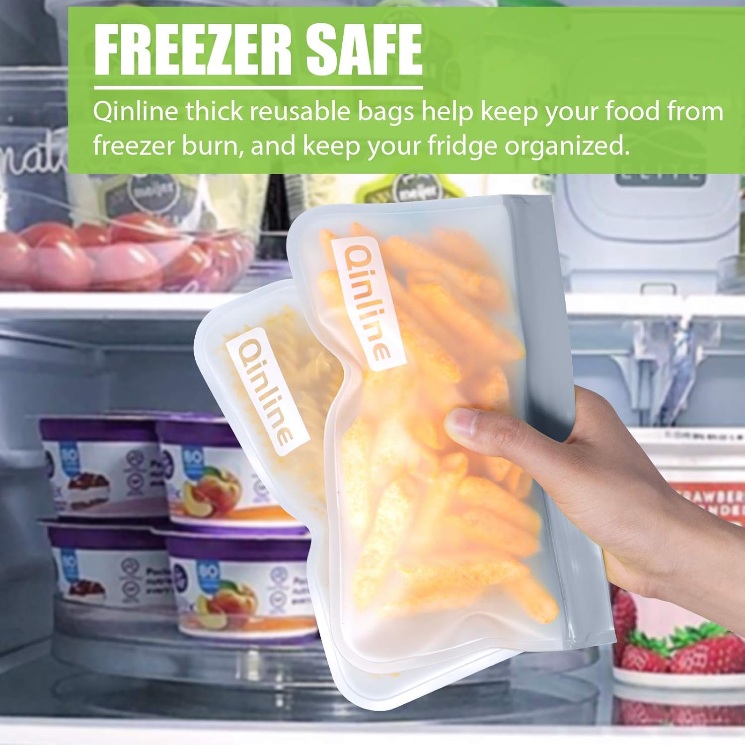 - REUSABLE FOOD GRADE MATERIAL & EASY TO CLEAN: Made of food-grade PEVA material, Qinline reusable storage bags are non-toxic, save our planet and save your money. We recommend HAND WASH, for the dishwasher will damage the double closure of the food storage bags. It is easy to clean with the bottle brush and put the bags on the top of a mug or cup to air dry. Using Qinline reusable non-toxic storage bags to save our planet and save your money