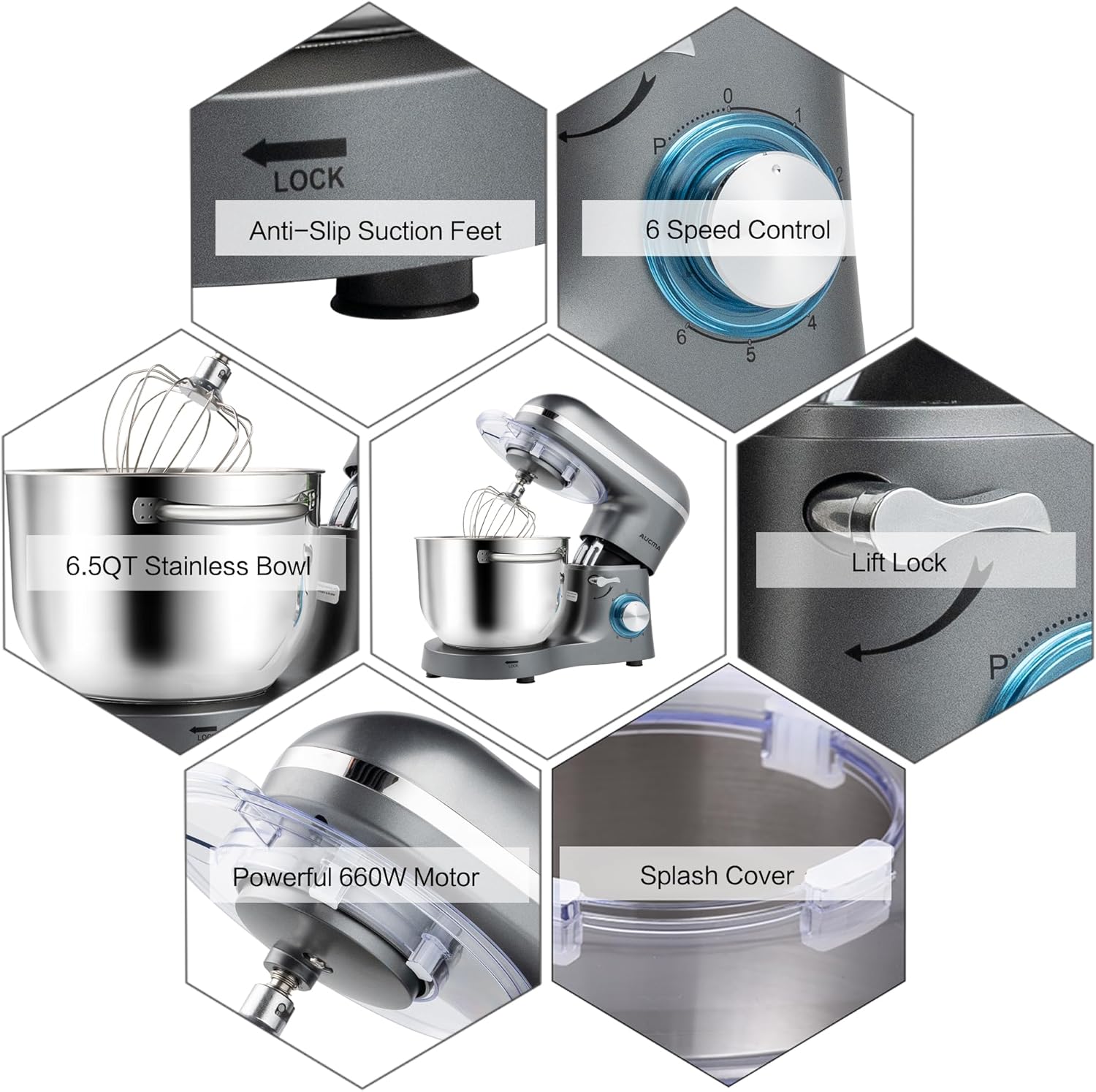 Aucma Stand Mixer,6.5-QT 660W 6-Speed Tilt-Head Food Mixer, Kitchen Electric Mixer with Dough Hook, Wire Whip & Beater (6.5QT, Gray)