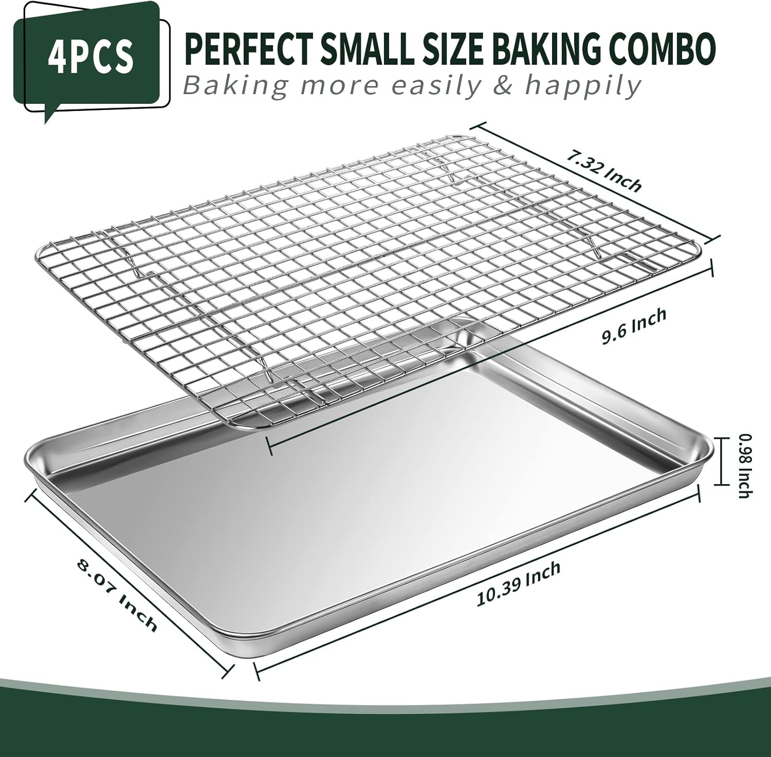 CEKEE 4 PCs Small Baking Sheet With Wire Rack Set [2 Pans + 2 Cooling Racks], 10 Inch Stainless Steel Tray - Rust & Warp Resistant, Easy Clean