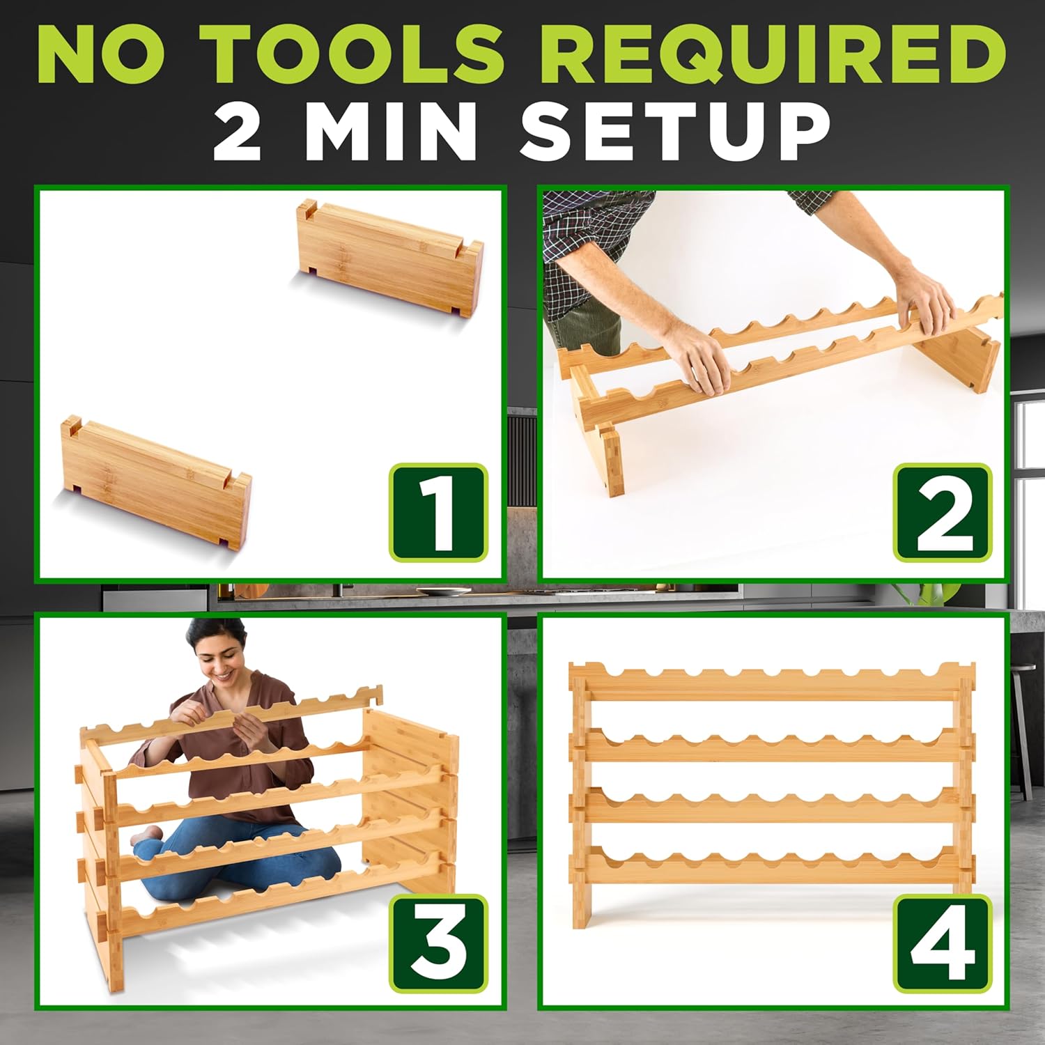 NutriChef Bamboo Stackable Wine Rack, 4-Tier 36 Bottle Capacity Wine Racks Free Standing Floor, No Tools Assembly, Modular Storage Display Shelf for Kitchen and Cellar 33.5" x 10" x 21"