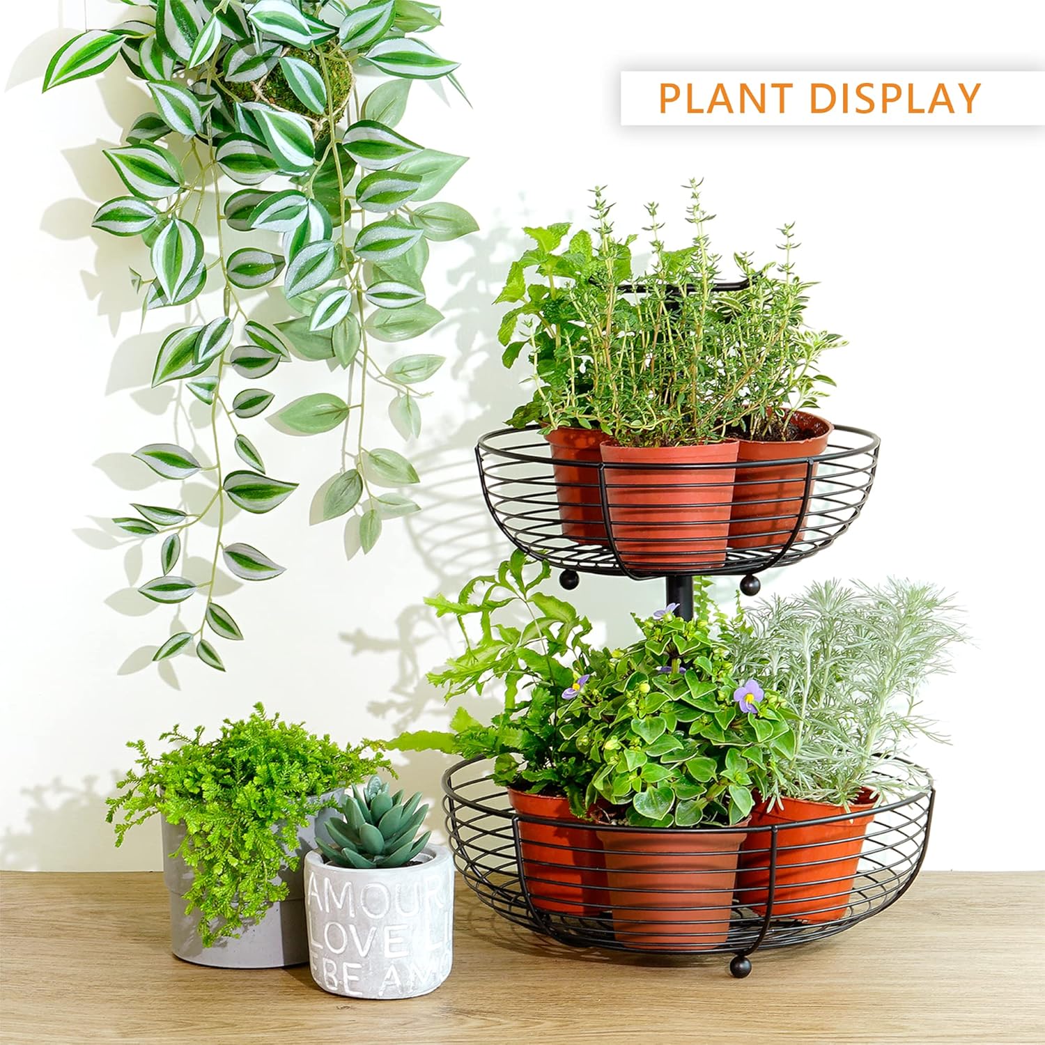 - MULTI-USE - One-tier hook hanger for bananas, snacks, and other hanging accessories. Two tiers baskets for candy or coffee table snacks storage.