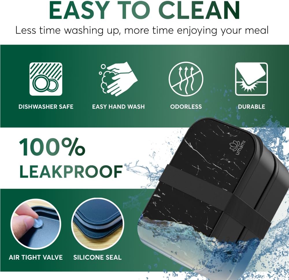Umami Bento Box Adult All-In-1 w/4 Utensils, 2 Sauce Jars, 2 Dividers, 100% Leakproof, Microwave & Dishwasher Safe, Stackable Lunch Containers for Men/Women, Matte Black & Marble, 68 oz