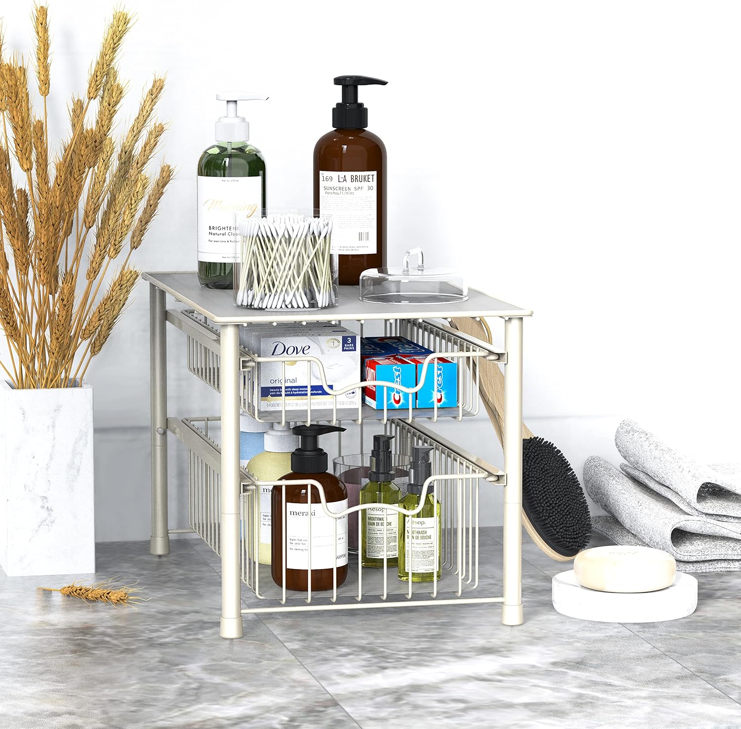 - Two drawers and the top surface hold lots stuff. Great for kitchen, bathroom and storage room organization. Gain more space in the cabinet, pantry room or even open space.