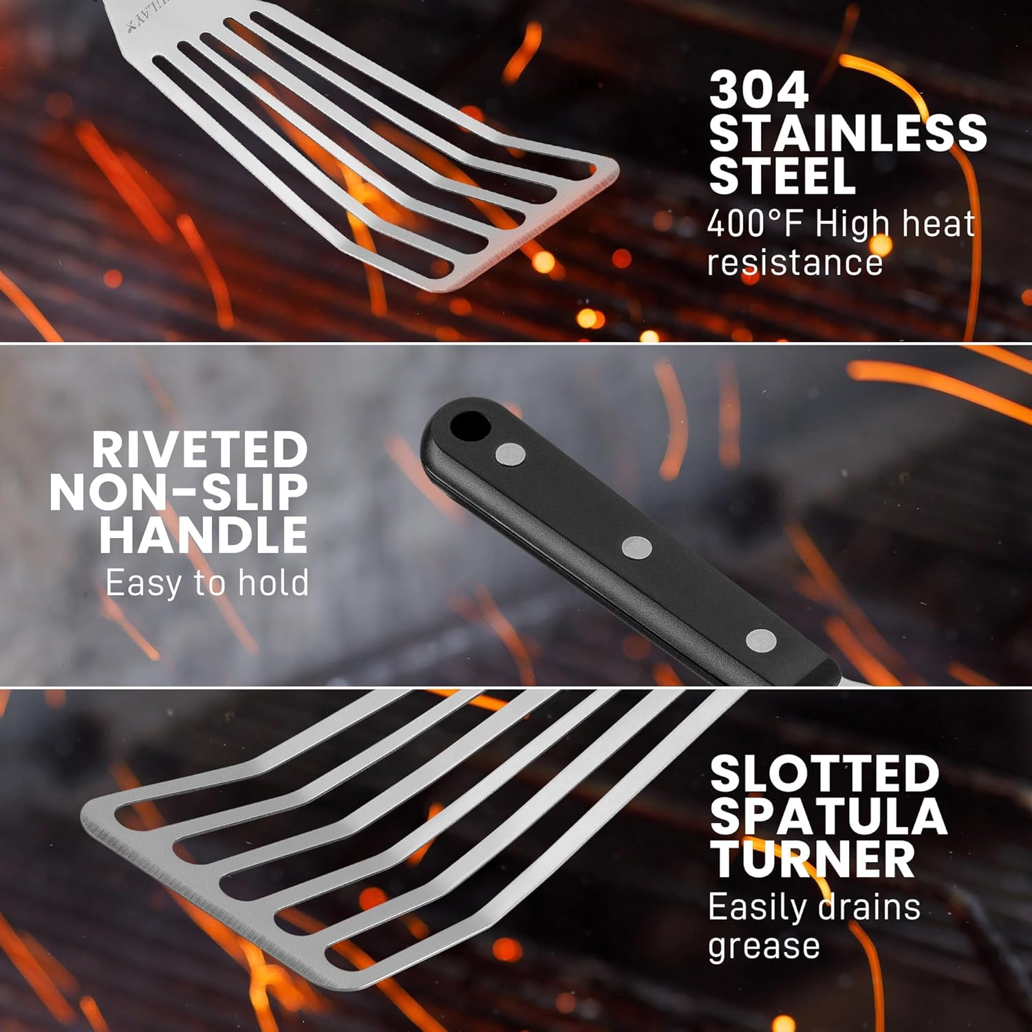 - This metal fish spatula is crafted with top-grade stainless steel, designed to withstand heat up to 400Β°F. Its thin, slotted design allows for precise and effortless flipping, making it perfect for delicate foods such as fish, eggs, and vegetables. The balanced construction ensures easy handling, providing excellent control when turning or lifting food.