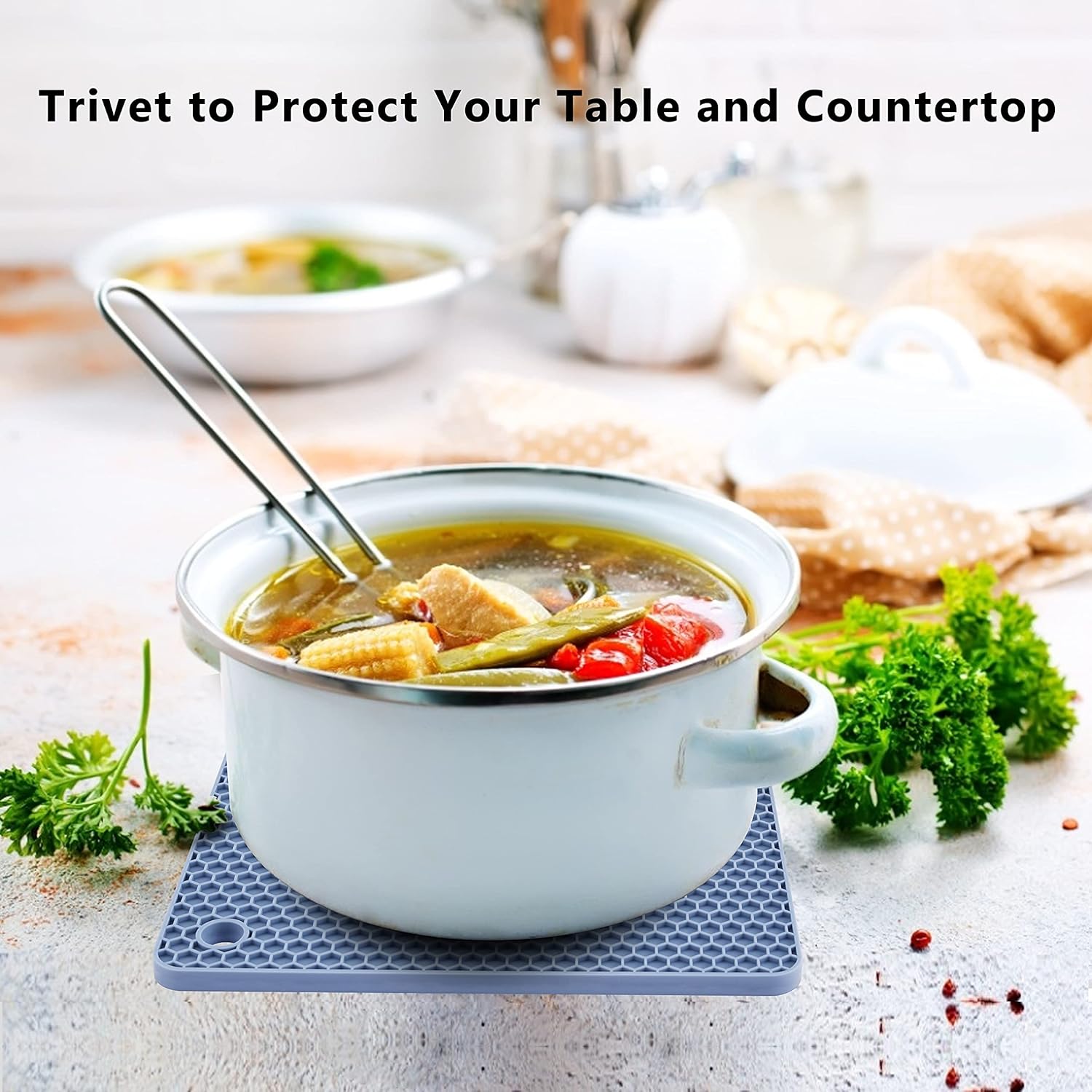 - πγ FOOD-GRAGE SILICONE TRIVET MATγ- The blue square silicone heat resistant mat are soft, light weight, durable, are perfect for protecting table. The blue color is neutral color, the mat is enough to go with most of the other things in the kitchen.