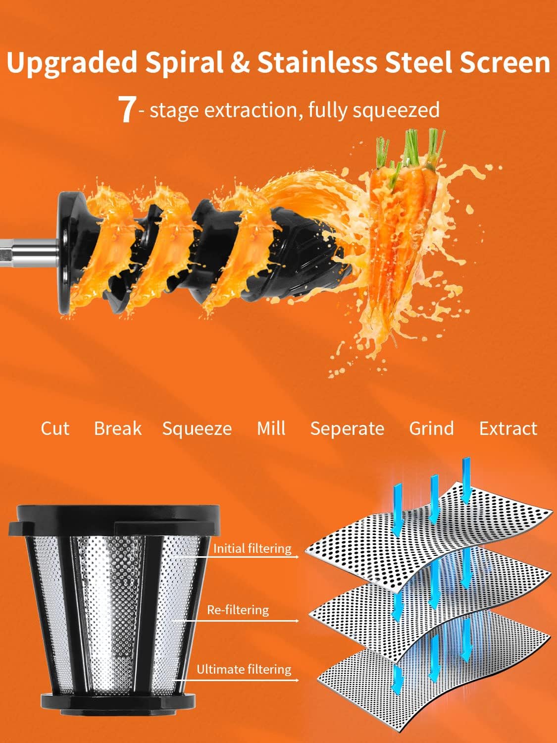 - Real High Juice Yield: Your personal juicer uses cold press technology that work at much slower speeds to squeeze fruits and vegetables. 7-segment masticating spiral system, slowly cut, break, grind and extract the most juice, from pineapple to ginger. 3-stage fine filter screen holes, strain the extracted juice again. This well-designed juicer will provide higher juice yield, drier pulp, and smoother, less foamy juice.Slower speed and lack of heat make it quieter than centrifugal models.