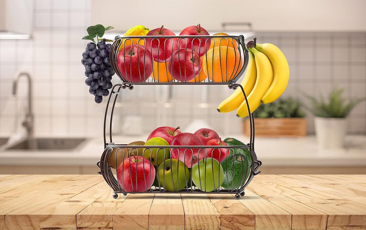 - 2 tiers fruit bowl to hold various sized fruits, such as bananas, grapes, apples and oranges.