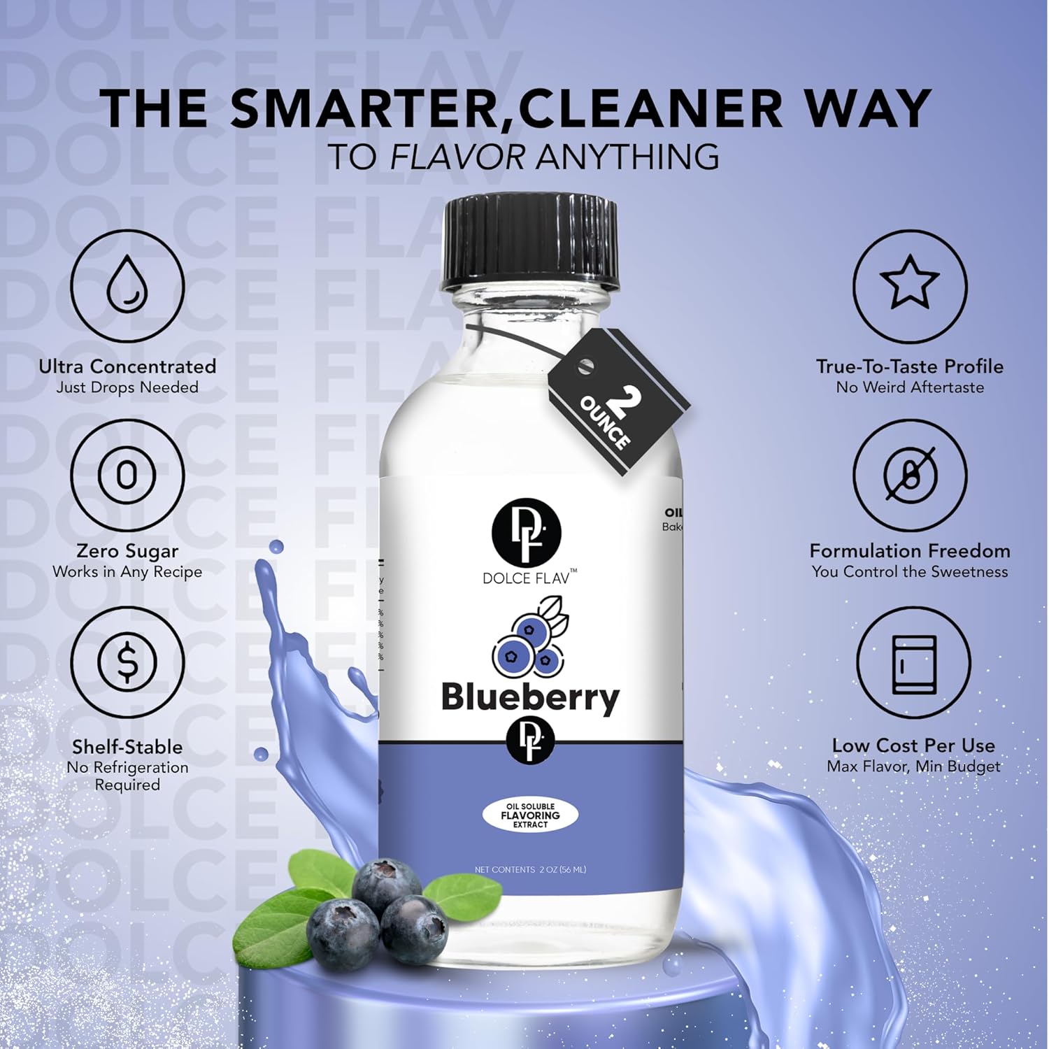Dolce Flav Blueberry Extract – 2 Ounce Oil-Soluble Kosher, Sugar-Free, Concentrated Ripe Blueberry Flavoring for Baking, Chocolates & Desserts, Includes Measured Dropper