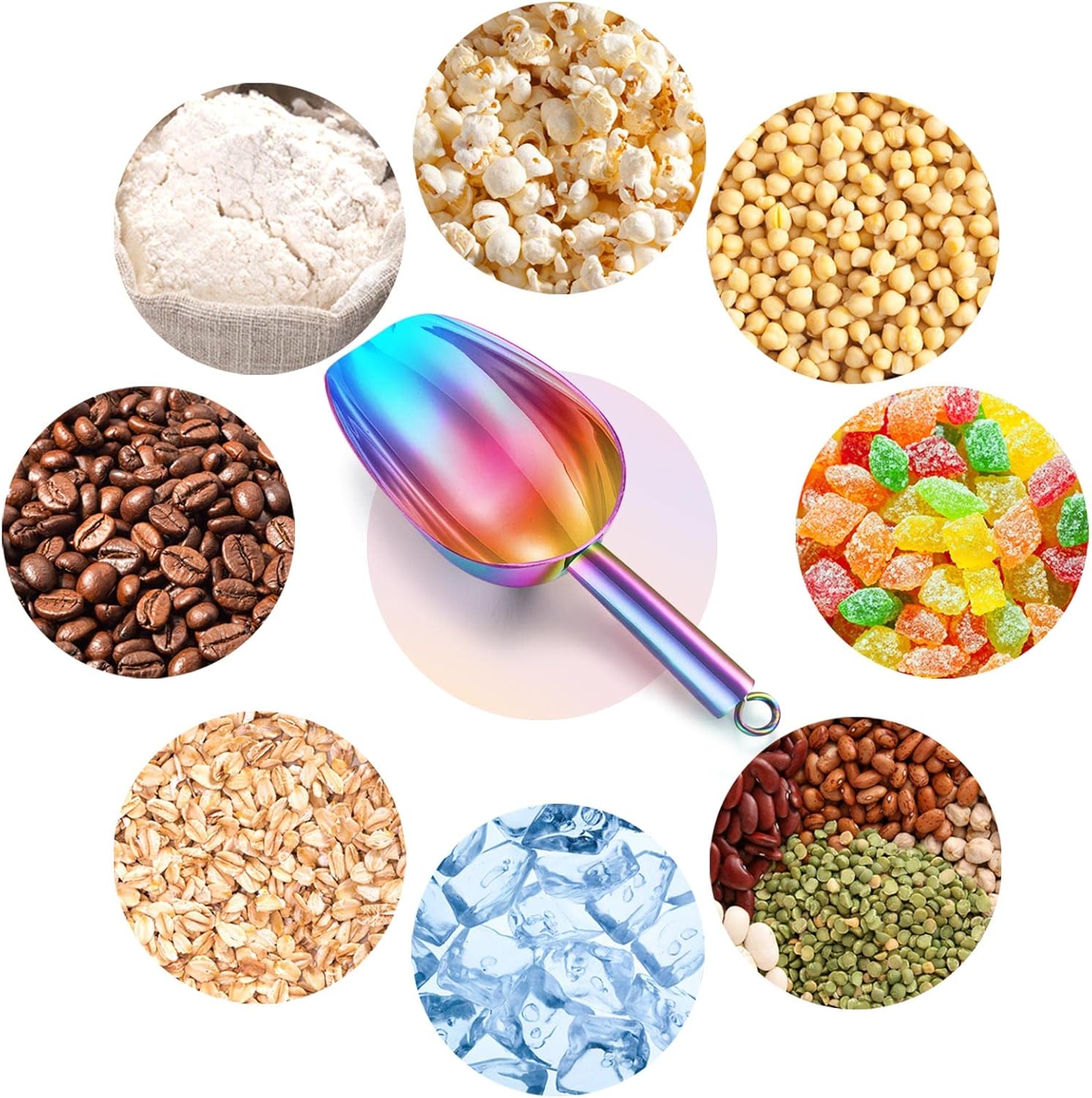 - Versatile: 5 oz capacity metal scoop Overall length 8.2 inch, Bowl 4.6ββ L x 2.7ββ W x 1.5ββ H, Handle 3.6ββ, Ideal for scooping ice cubes, candy, coffee beans, flour, Also could be used as dog cat food scoop, Meet all your requirements
