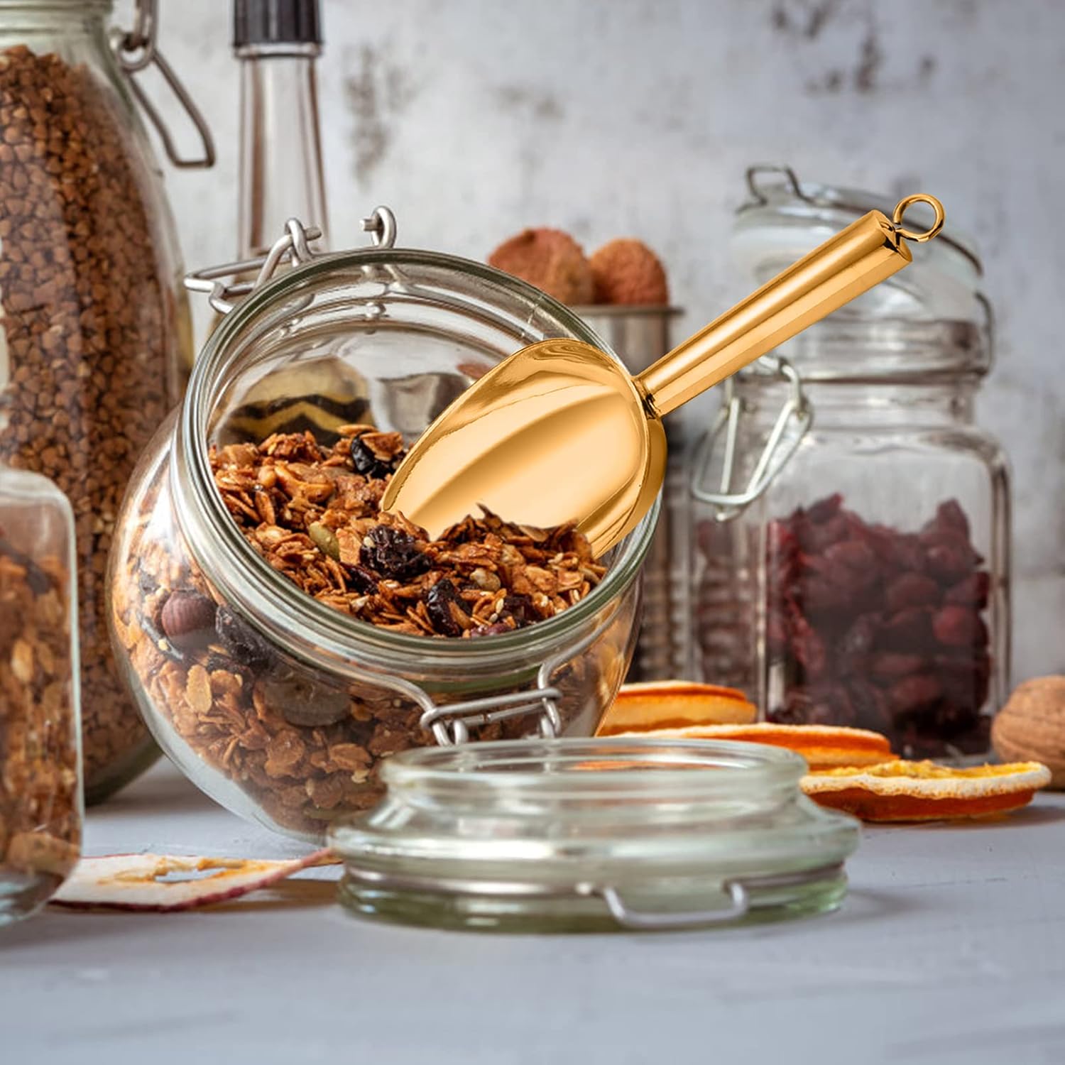 - Multi-Purpose: 5oz metal ice scoop, Overall length 8 inch, Bowl 4.5ββ L x 2.7ββ W x 1.5ββ H, Compact size to scoop from small bins or containers, 2 pcs meet different uses to scoop ice cubes, coffee beans, grains and flour at the same time