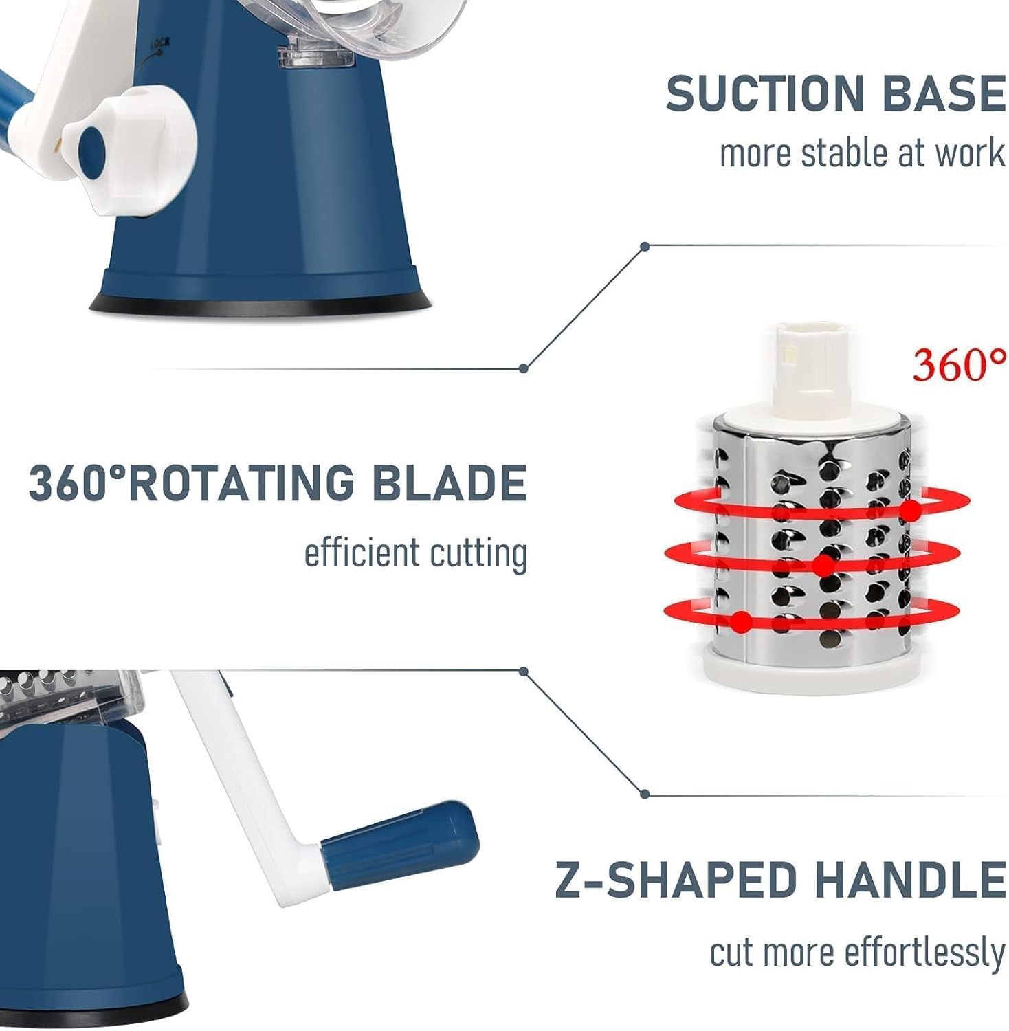 KEOUKE Rotary Cheese Grater with Handle - 3 Changeable Blades for Cheese, Vegetables, Nuts - Blue