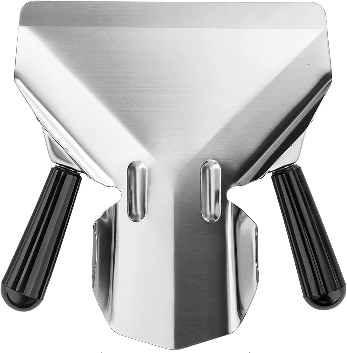 - Dual Handle Fry Scooper is made of hardy, corrosion-resistant stainless steel,Suitable for commercial use, featuring a wide shovel for scooping and a funnel shape on the opposite side, allowing you to easily direct fries into a serving container. This scoop is the ideal foodservice tool for any quick-serve, fast food, or casual restaurant.