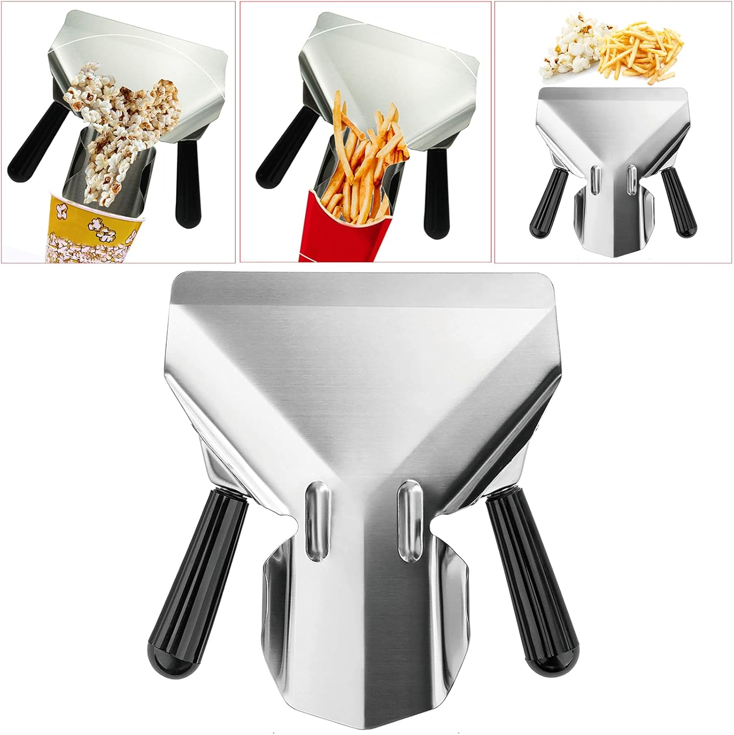 - Easy and quickly fill fries or popcorn into bag,boxes and bowls.Easy to clean, Dishwasher safe, No flaking, chipping, or discoloring.Designed with dual handles for both right-handed and left-handed users. Featuring angled handles for quick scooping and bagging,perfect for personal or commercial use.