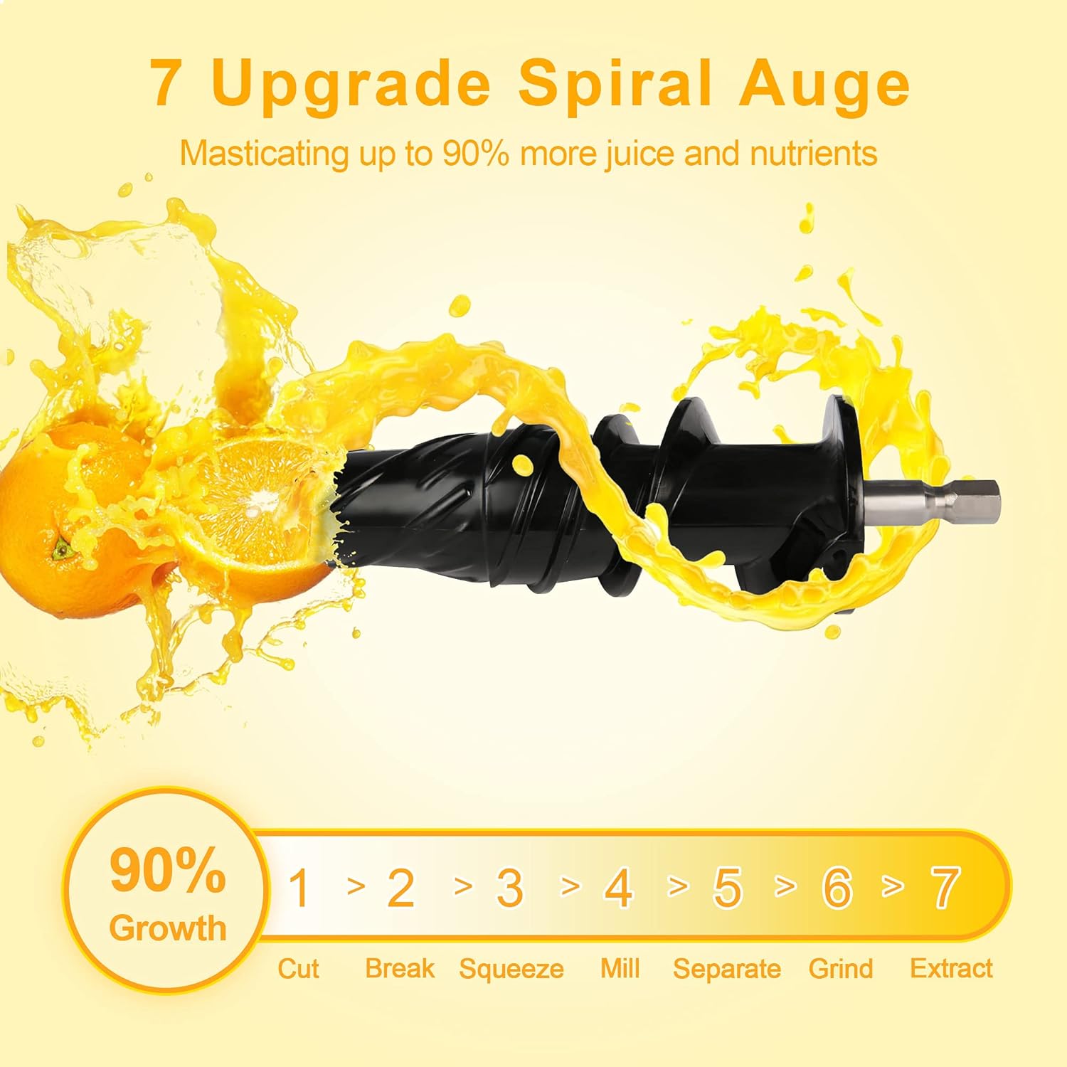 - ăUpgraded Masticating Juicers & Quiet PerformanceăThe upgraded spiral auger increases juice yield while retaining more nutrients and minimizing oxidation. The motor operates at less than 60 dB, ensuring a quiet juicing experience. It also automatically shuts off after 20 minutes of use for safety and energy efficiency