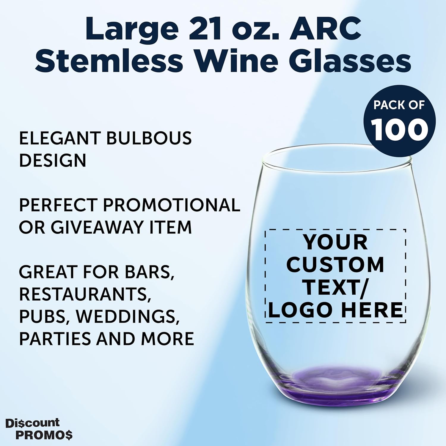DISCOUNT PROMOS 100 ARC Stemless Wine Glasses Set, 21 oz. - Customizable Text, Logo - Chardonnay, Cabernet, Merlot, Sauvignon - Purple