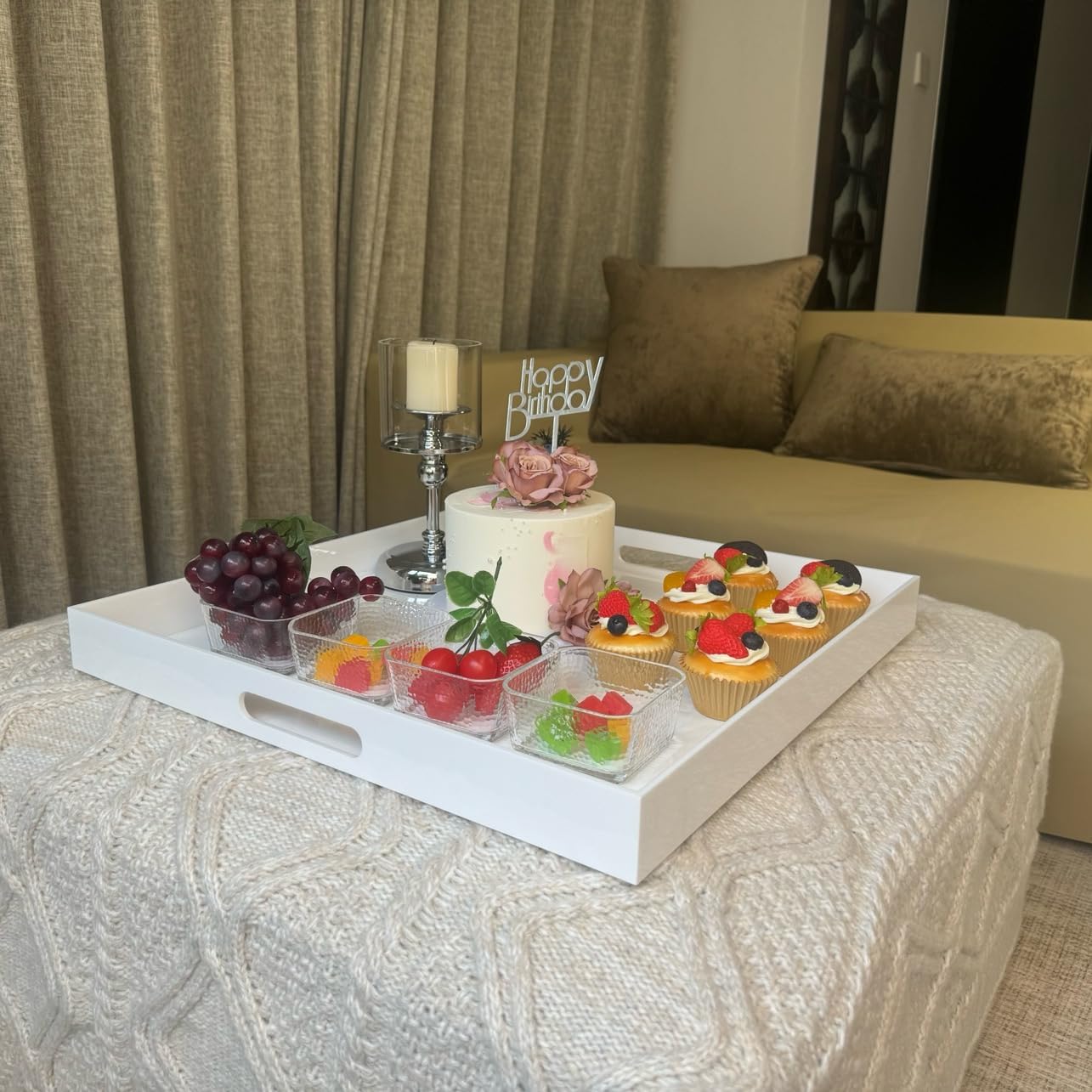 - Multifunctional: Serving tray for serving breakfast, appetizers, coffee, drinks, desserts, snacks, fruit, cheese, food; Decorative organizer tray for cosmetics, jewelry, remote, glasses, ornaments, magazines, Tray can be put on an ottoman, bed, coffee table and couch, It’s elegant to be put on any tabletop or countertop as an accessory