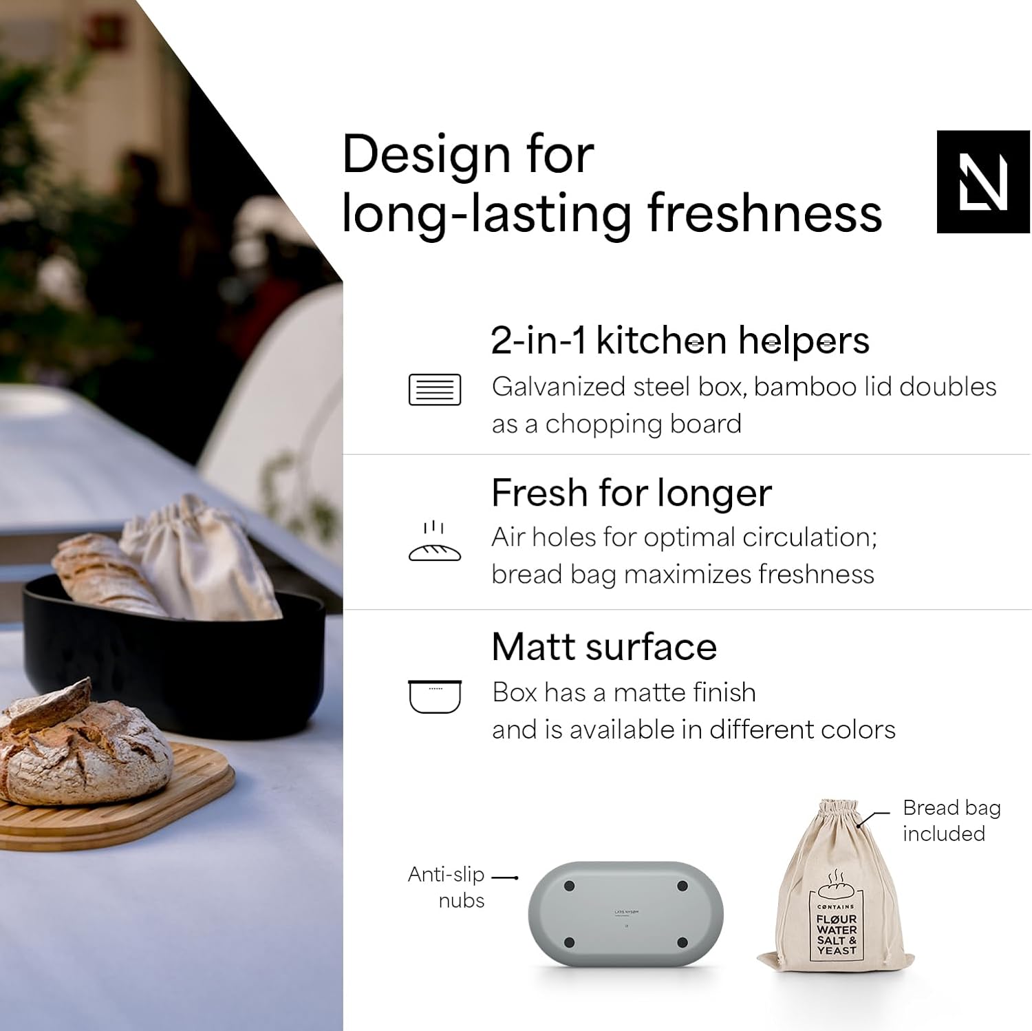 LARS NYSØM Bread Box I Metal Box with linen bag for long lasting freshness I Bread Bin with bamboo lid usable as cutting board I 14.2x7.5x5.1 In (Ash Gray)