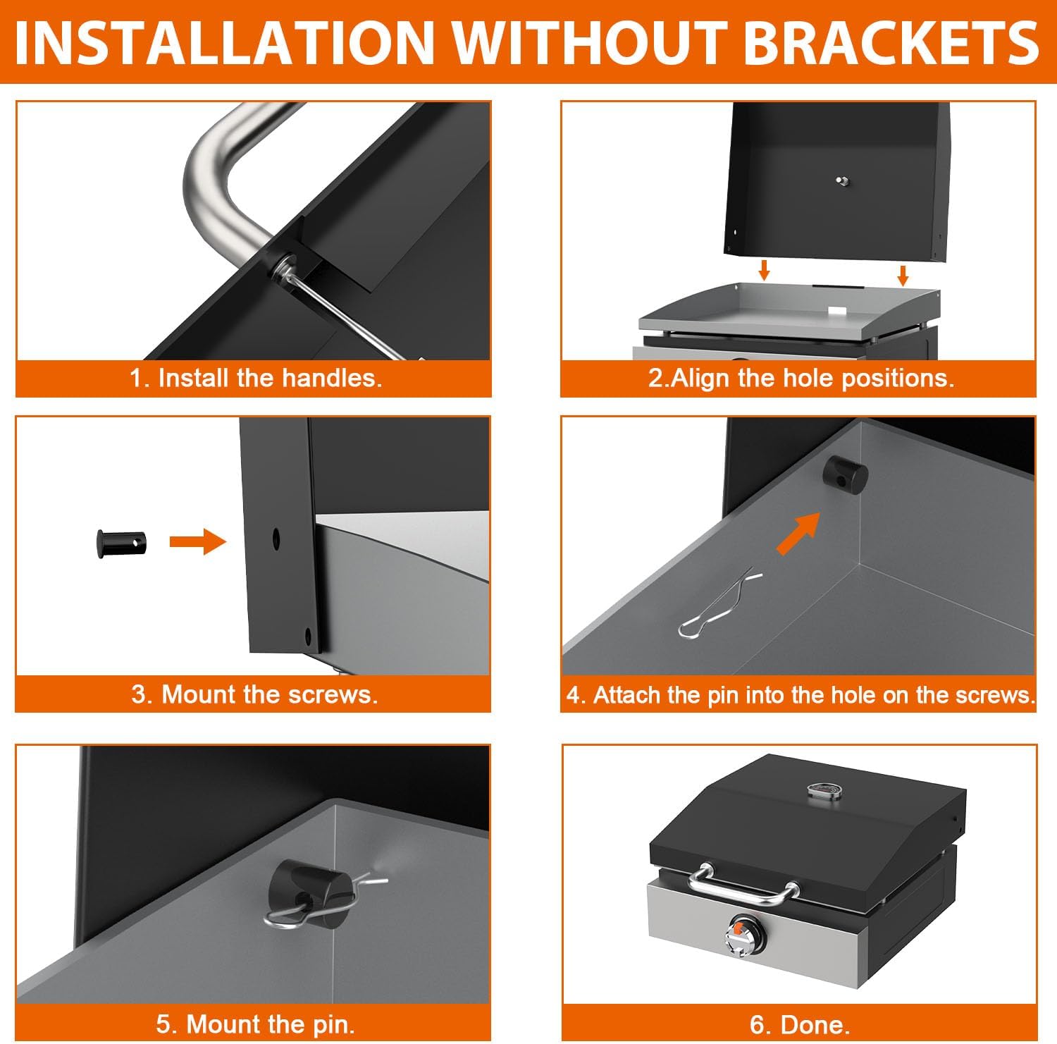 - When your griddle plate has no holes in both sides, use the the brackets to match the griddle cover with your griddle body.