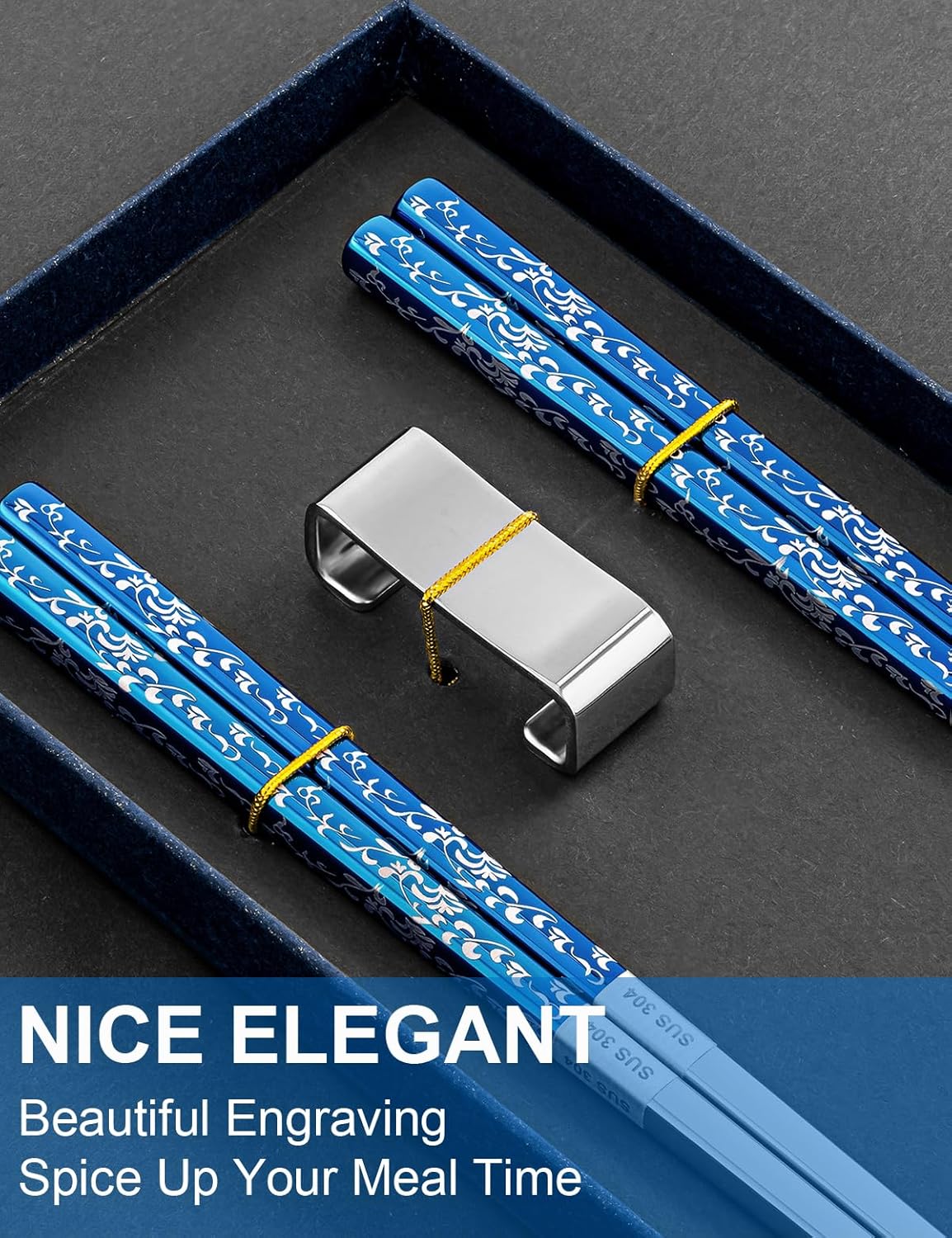 Metal Chopsticks Reusable 2 Pairs Titanium Plated Stainless Steel Chopsticks with Holder, Dishwasher Safe Non-Slip Japanese Style Chop Sticks Present Set (Blue Silver)