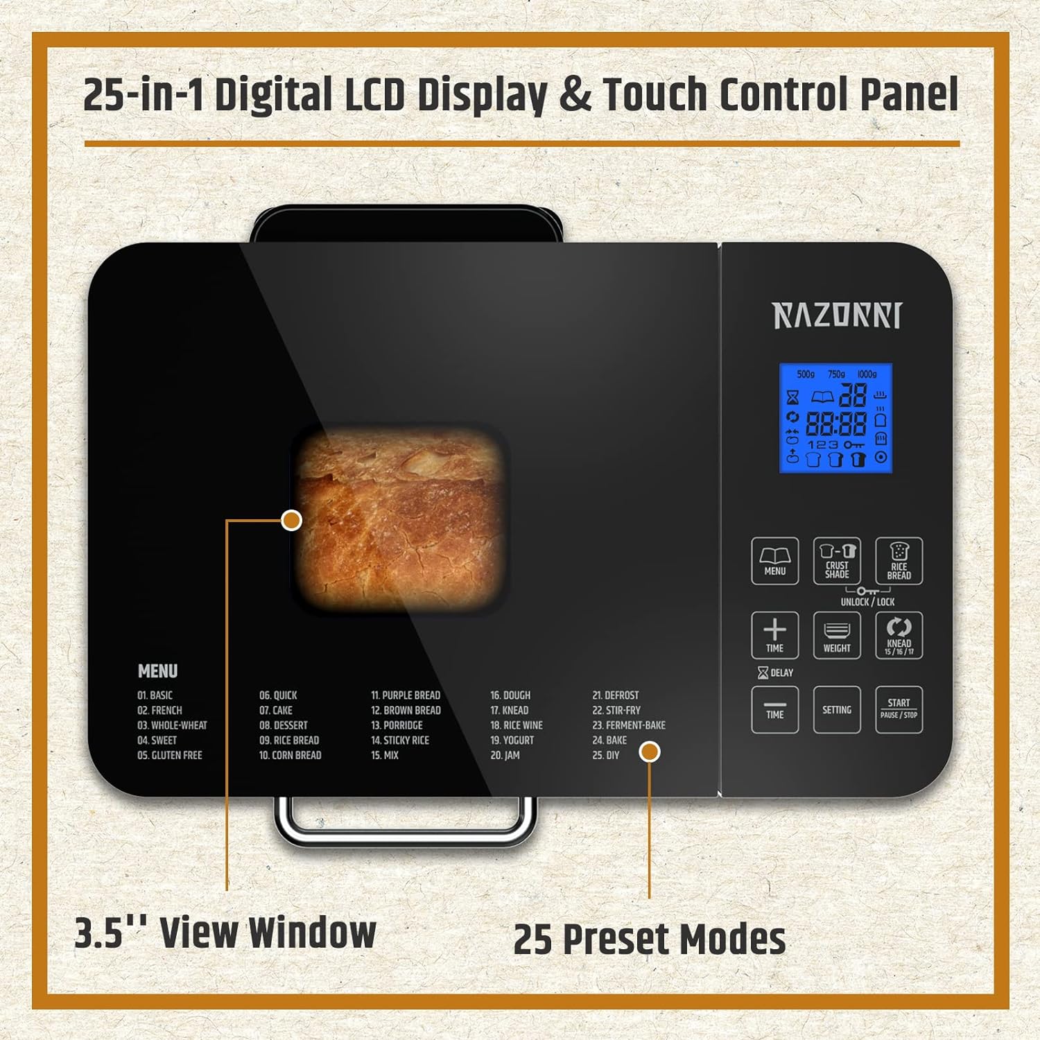 - Easy to Use: Lockable digital LCD display and touch control panel, large viewing window to check the bread, heat-resistant stainless steel handle, surrounded heating element for evenly baking bread.