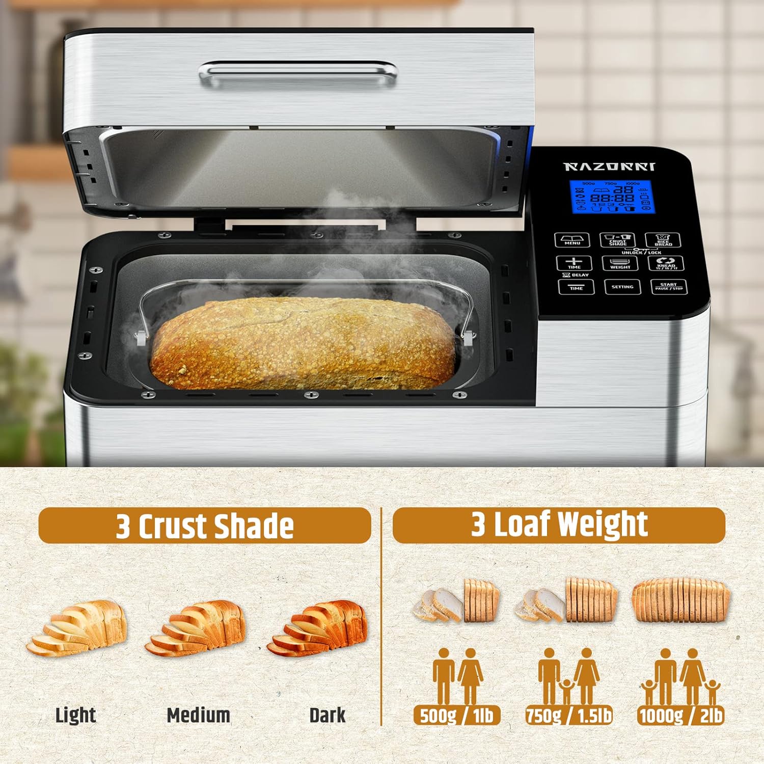 Razorri Bread Maker Machine Stainless Steel UL Certified, Nonstick Bread Pan, Homemade 2Lbs Breadmaker, Gluten-Free Setting, 15H Delayed-start, 1H Keep Warm, 3 Crust Colors and 3 Loaf Sizes