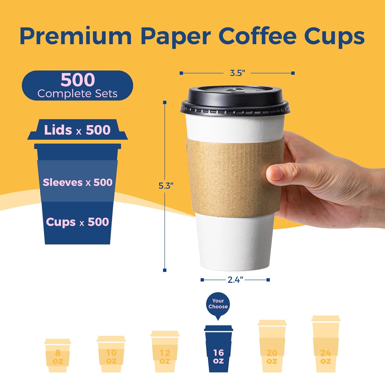 Fit Meal Prep 500 Pack 16 oz Disposable Coffee Cups with Lids, Sleeves, Leak-Proof To Go Coffee Cups with Lids, Durable Paper Cups for Hot Beverage, Home, Office, Party
