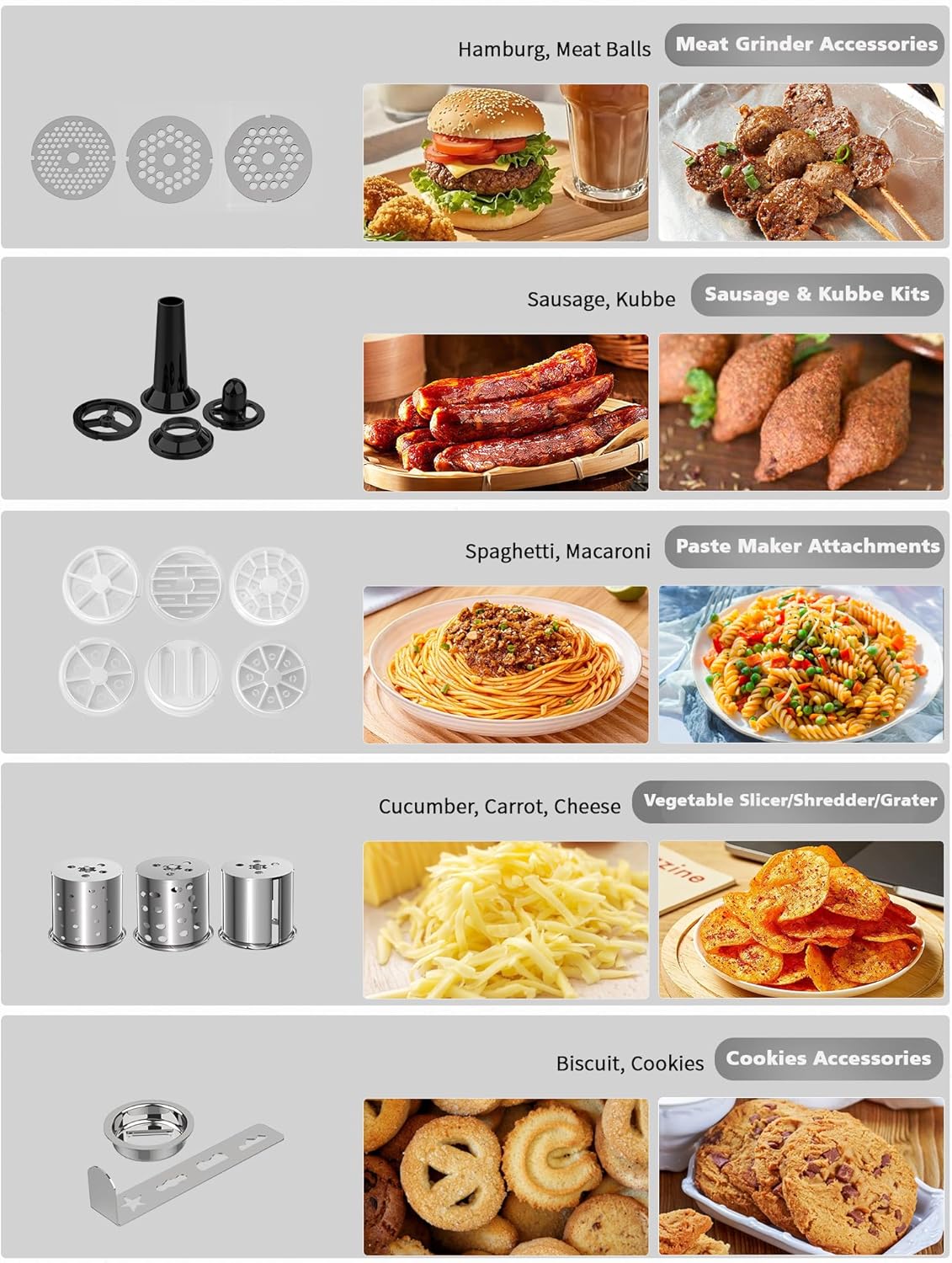 - 9-in-1 KITCHEN MACHINE - Vospeed kitchen stand mixer is a multi-functional food processor. It is equipped with a dough hook, whisk, beater, juice blender, meat grinder! Itβs a perfect kitchen helper for making cakes, bread, cookies, smoothies, juicer,salad, sausage, meat sauce etc. The splash guard helps to add ingredients without making a mess