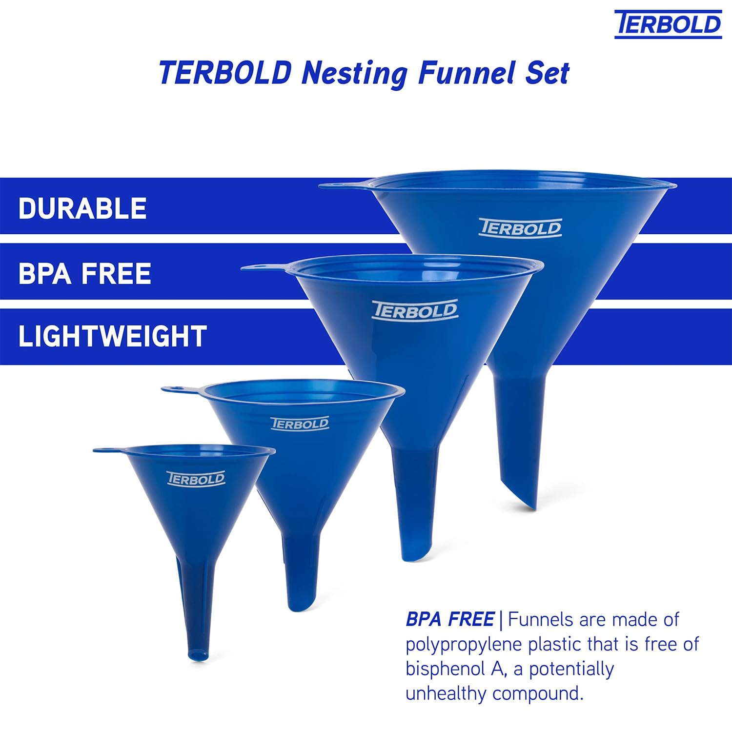 4pc Funnel Nesting Set in BPA Free Plastic for Kitchen Cooking, Car Oil, Home, or Lab Use (Blue)