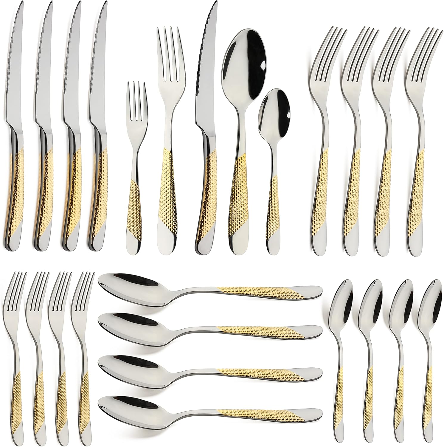 - 【Simple Desgin】The embossed pattern on the handle is a major feature of this cutlery set.The gold-plated process is adopted. The concave-convex pattern makes you not slippery in use. The design of the whole set of flatware looks simple and fashionable.