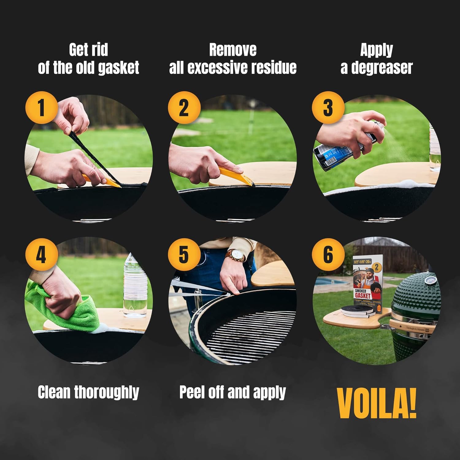 - ✔️ [ HI TEMP RESISTANCE ] With strong adhesion, the self-adhesive BBQ high heat gasket for smokers is easy to stick and apply and fits the most grills: 1. Scrape / Remove the old gasket; 2. Clean and degrease the surface; 3. Peel off safe-adhesive backing (as the adhesive might be very strong, you can use an oblique cut to get rid of the paper backing); 4. Stick the gasket around the edge of the Grill and its lid; 5. Cut the excessive length; 6. Close the lid and wait for 12 hours.