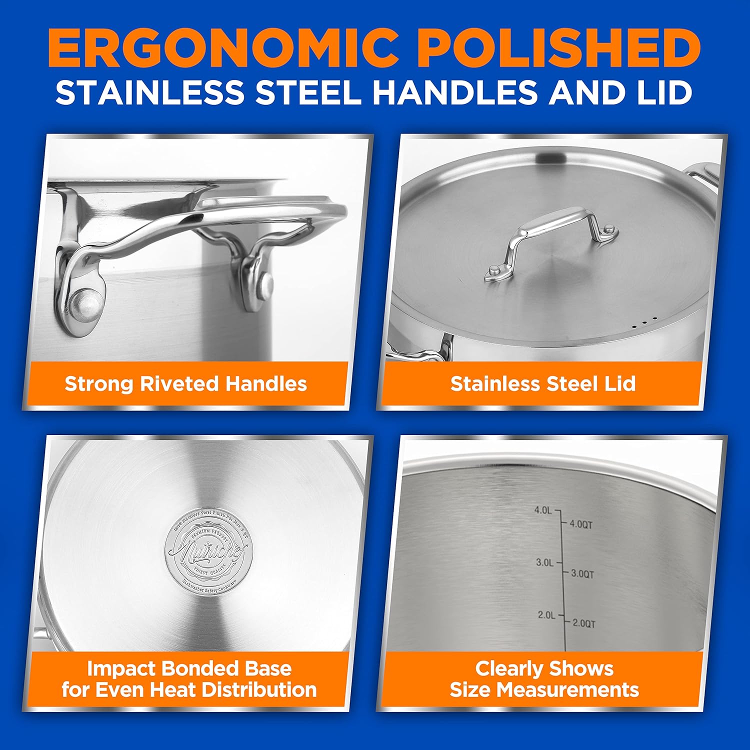 - INDUCTION READY: The heavy duty stainless steel stock pot is designed for safe use in electric, gas, induction, ceramic, hot plate & halogen cook tops. Though dishwasher safe, hand washing is highly recommended to preserve the stainless steel shine