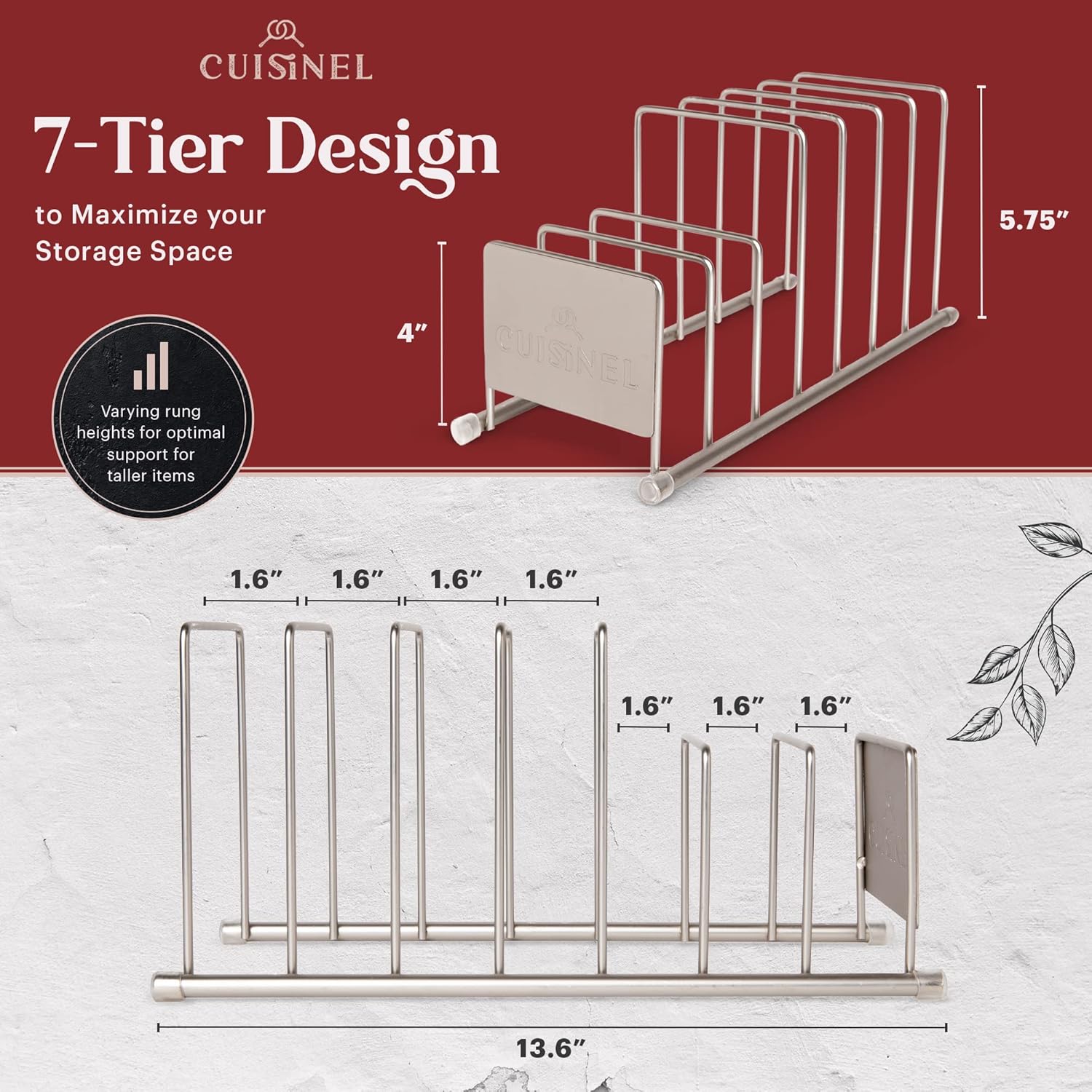 Cuisinel Lid and Dish Organizer Rack - Satin Nickel Silver Kitchen Storage Organization Stand - Plate Holder, Pan/Pot Covers, Cutting Board and Cookie Sheet Divider - 7-Tier Cabinet/Counter Display