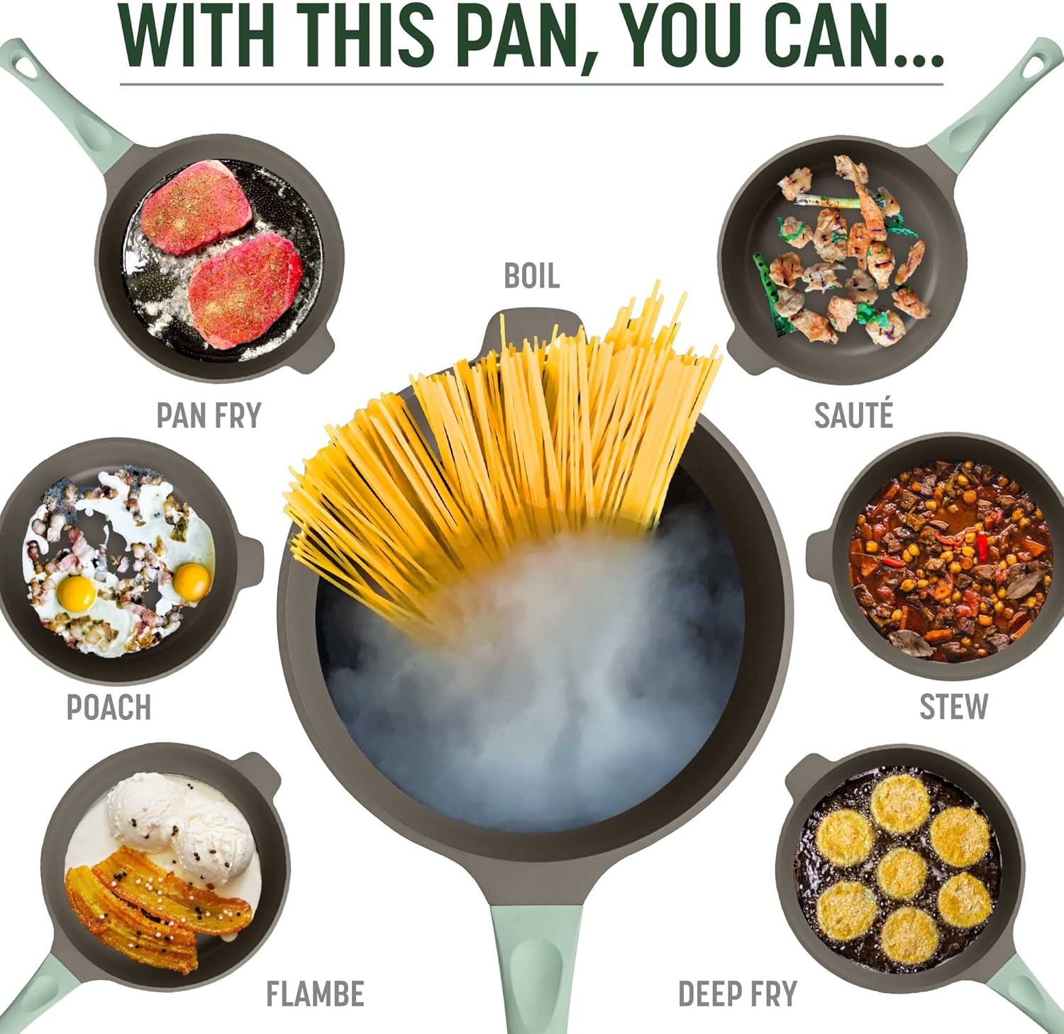 - MULTI STYLE COOKING OPTIONS: Pan fry, sauté, sear, boil, simmer, blanche, braise, poach, deep fry, stew and then serve in style. No matter what you’re cooking, this pan is always up for the task. Also compatible with electric, gas and glass stovetops.