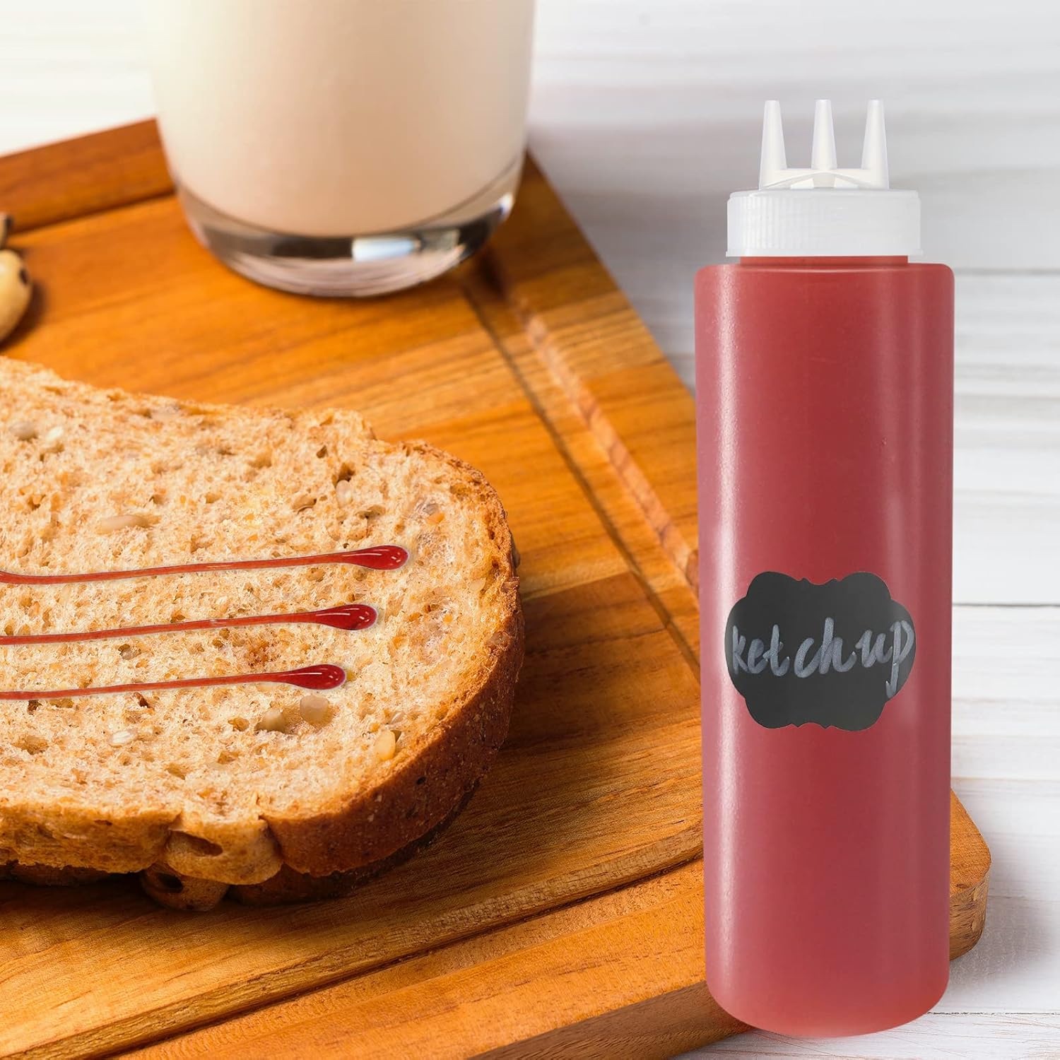 - Package Contains: 4 pack of 32oz (100ml) 3-Hole squeezable squirting bottles with extra 8 Chalk Labels, 1 Pen.