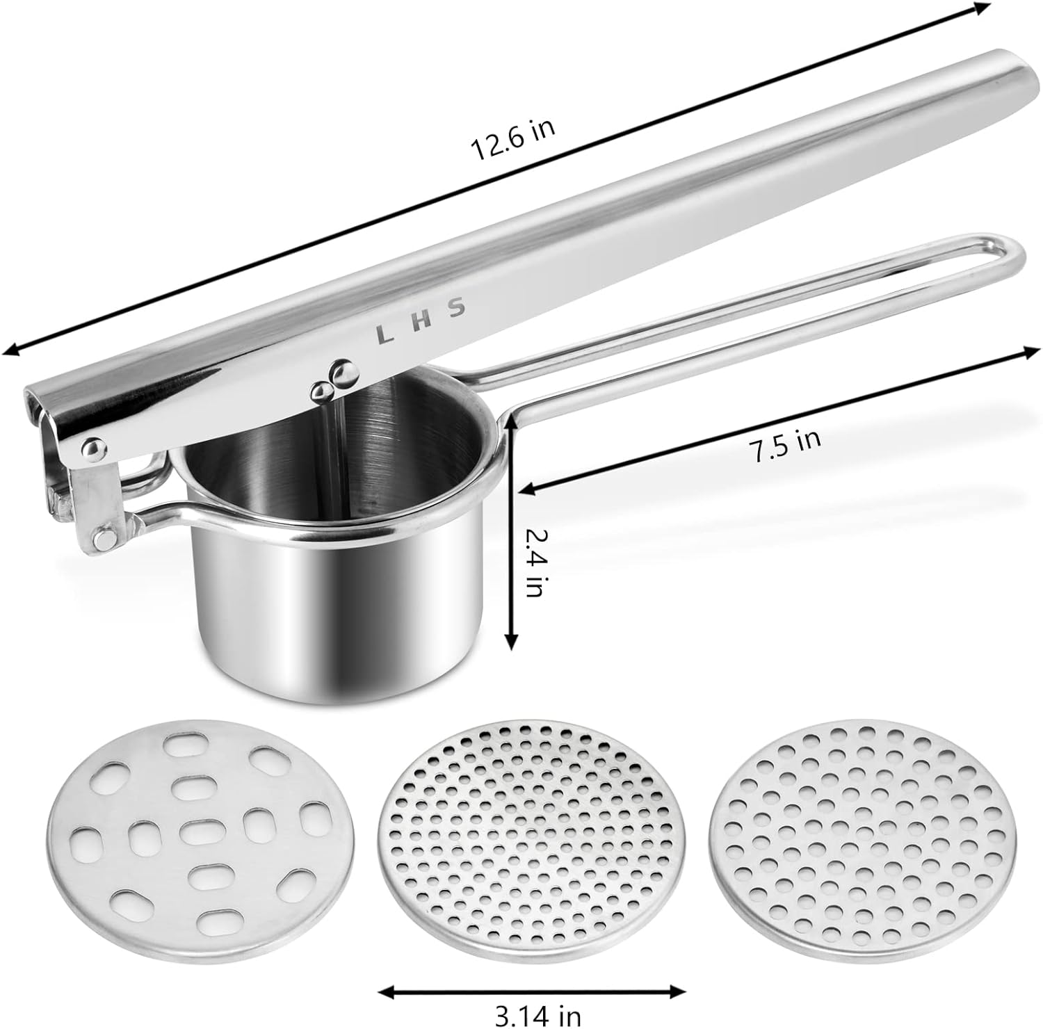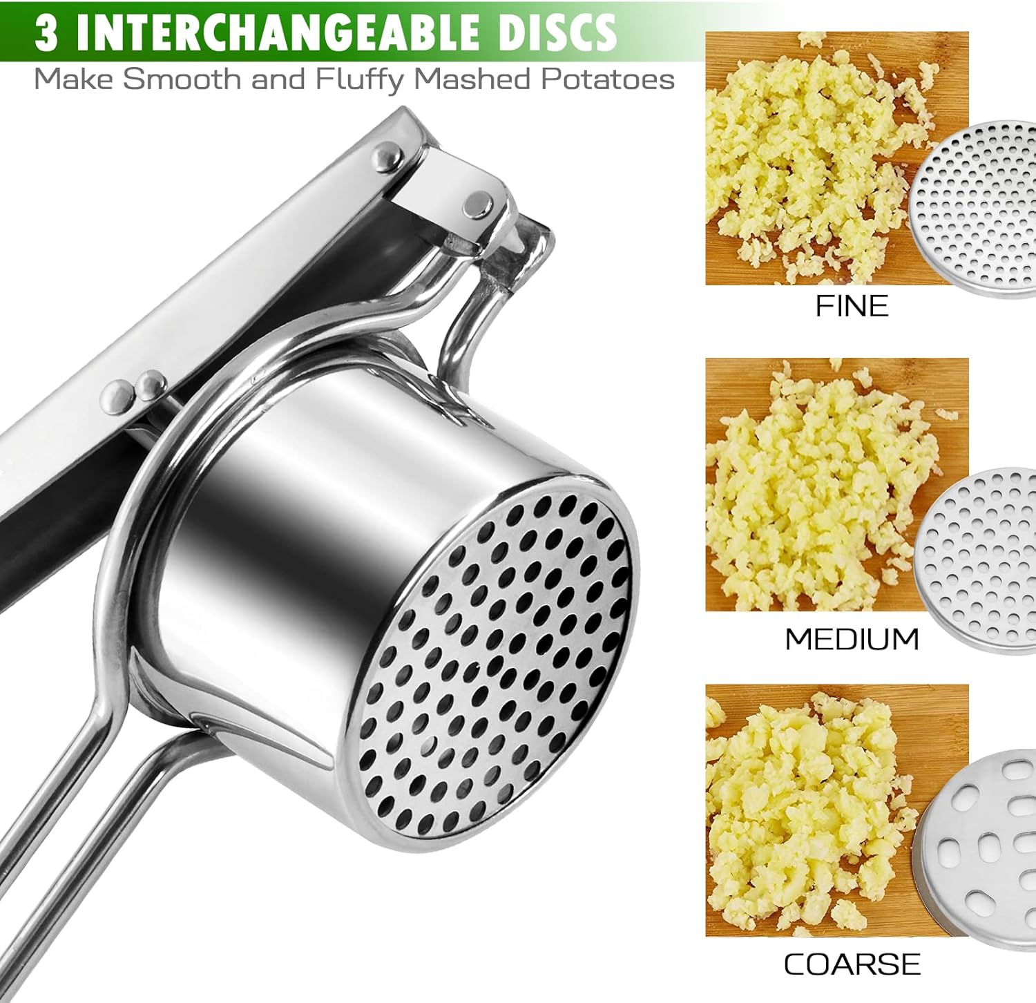 - MUFTI-FUNCTION POTATO MASHER: Our ricer comes with 3 changeable discs that give you full control of your meals. The potato ricer not only used for mashed potatoes, but also very suitable for carrots, pumpkin rice, yam, pumpkin, etc.
