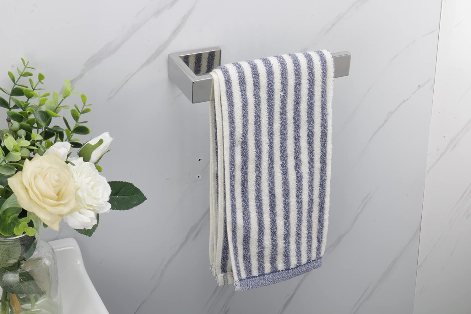 - PREMIUM 304 THICKEN MATERIAL: Very heavy duty 9IN hand towel holder, it makes of 304 stainless steel thicken material brushed nickel finished, Never rust. We care about every details, the welding part of the product is polished by multiple processes, making it seamless and smooth will not hurt your goods