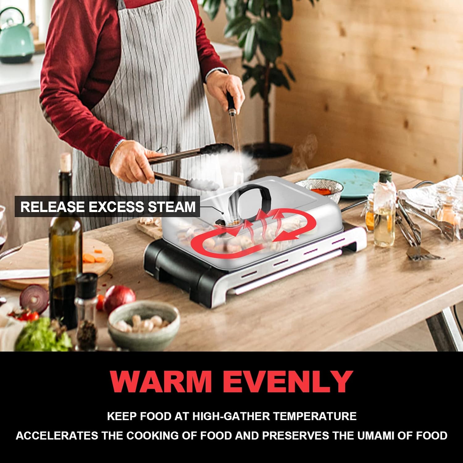 - HIGH COOKING EFFICIENCY - Measured 13 x 9.75 x 2.6inches of melting dome has sufficient space for heat and steam to circulate, Large enough to cover multiple hamburger patties, a lot of veggies, several steaks, bacons, BBQ skewers, grilled salad and more, Fits in rectangular cast iron skillets, flat tops, teppanyaki, stove griddles and all grills
