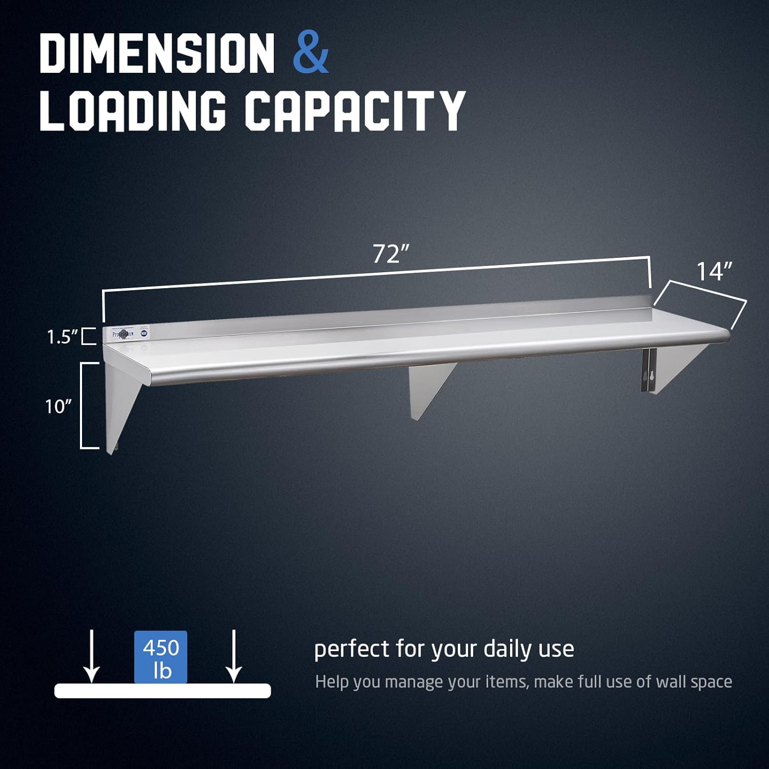 - Strong Bearing Capacity: It has excellent bearing capacity. The 72 inch metal wall mounted shelf can bear 450 lb and can be used to place condiments, kitchen supplies, including microwave ovens, ovens, rice cookers and other heavy objects. The size is 14 "W x 72" L. It adds extra storage space to help you arrange your kitchen space and keep it tidy